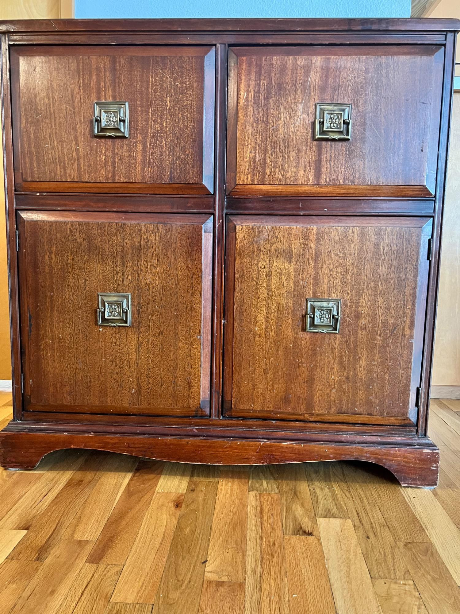 Bring vintage charm to your space with this beautifully crafted oak storage cabinet. Featuring a rich wood grain, sturdy craftsmanship, and intricate brass handles with floral detailing, this versatile piece blends style and functionality. Features: Unique brass hardware, sturdy construction, classic design Material: Solid oak wood Design: Four-door cabinet with spacious compartments for storage Dimensions: 32.5” W x 16” D x 33.5” H Condition: Good vintage condition with minor wear, adding character.