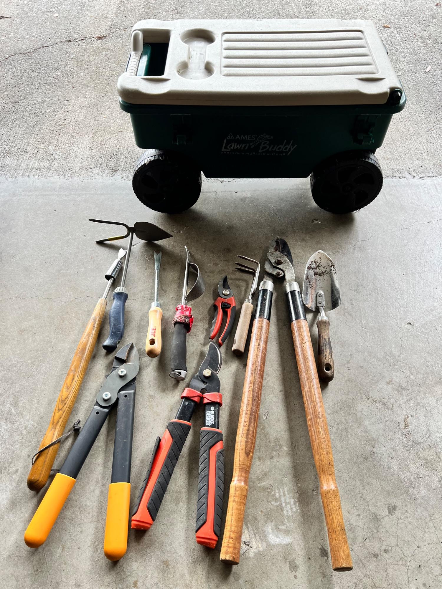 This Ames Lawn Buddy rolling garden cart comes with a set of assorted garden tools, making yard work more convenient and organized. The Lawn Buddy serves as a portable storage unit and seat, helping reduce strain while working on plants, flower beds, or landscaping projects. Lawn Buddy Details: Sturdy and Functional – Designed for outdoor use with durable plastic construction. Rolling Design – Moves easily across different surfaces with four solid wheels. Storage Compartment – Keeps tools and small items secure and within reach. Flat-Top Seat – Allows for comfortable sitting while gardening. Pruners & Loppers – For trimming and shaping plants. Hand Trowel & Cultivator – Useful for digging, planting, and loosening soil. Weeding Tools – Helps remove unwanted growth with precision. Shears & Clippers – For cutting branches and maintaining garden plants.