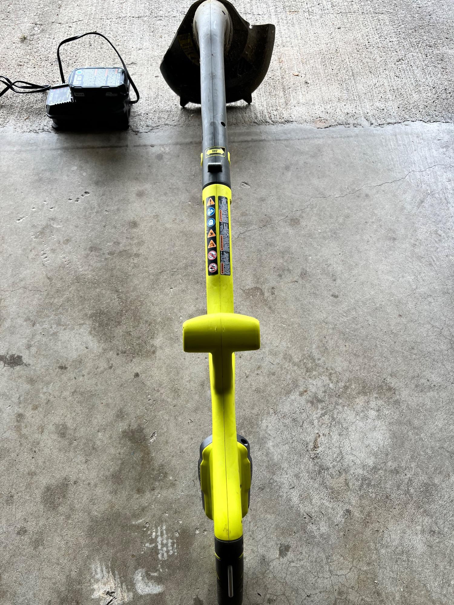 Take the hassle out of yard work with this Ryobi 18V ONE+ Cordless String Trimmer and Edger. Designed for ease of use and efficiency, this trimmer is ideal for maintaining small to medium-sized lawns, trimming overgrown grass, and edging sidewalks or flower beds. Features: Battery-Powered: No need for gas—runs on an 18V lithium-ion battery. Auto-Feed String Head: No bumping required; the string advances automatically. EasyEdge Technology: Quickly converts from a trimmer to an edger for a clean finish. Ergonomic Design: Comfortable grip for easy handling during extended use. Includes: Ryobi 18V battery and IntelliPort charger. Condition: Used, with visible signs of wear, but fully functional. See photos for details.