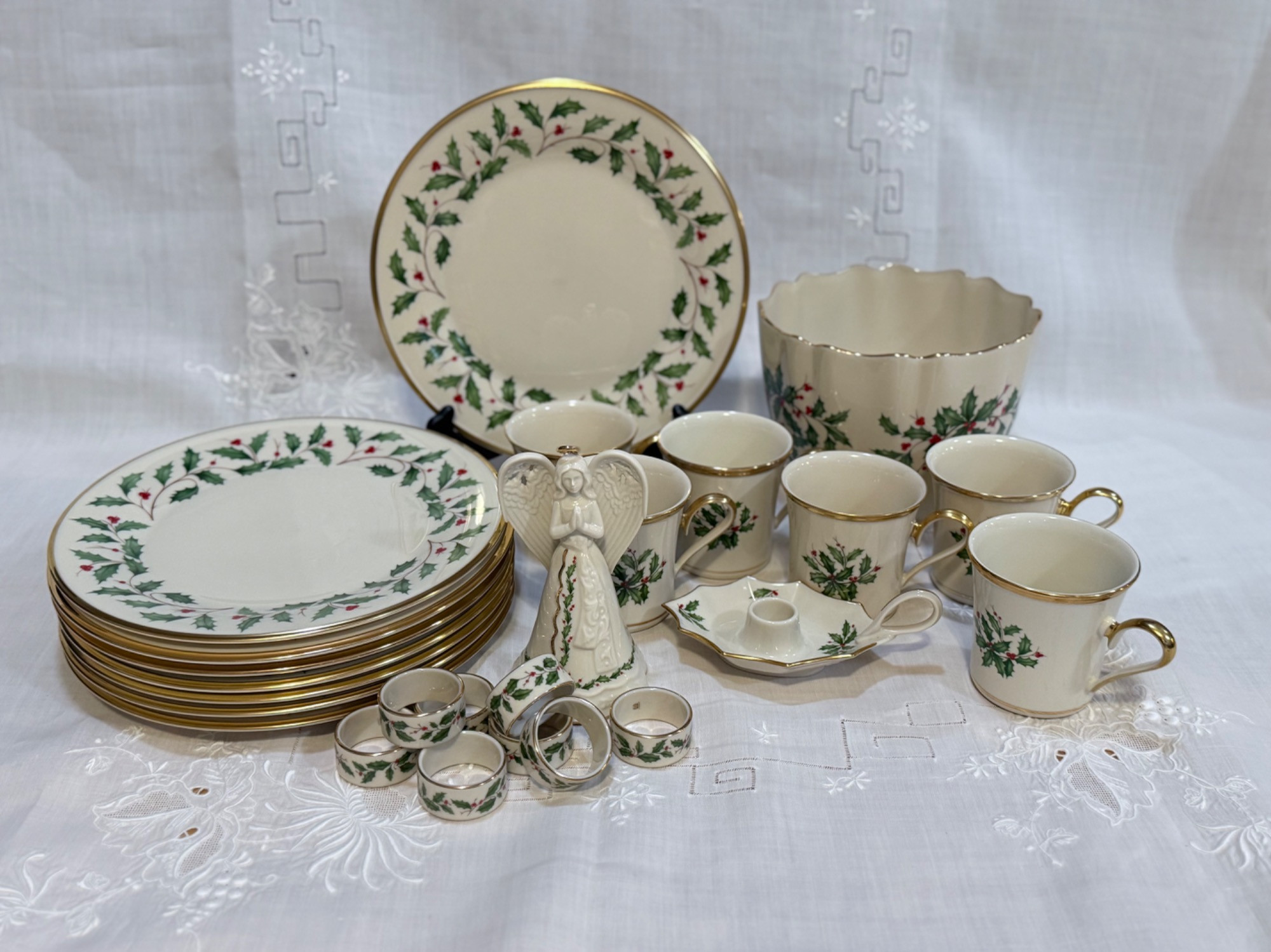 This Lenox Holiday Dimension Collection set is made of fine bone china and features the classic holly and berry pattern with gold trim. Made in the USA, this set includes a variety of pieces for holiday dining and decor. Set Includes: 8 Dinner Plates (10.5") 6 Cups with gold trim 1 Candleholder with handle 8 Napkin Rings 1 Large Bowl (7.5") 1 Bell Angel Figurine Condition: Good pre-owned condition, with some minor signs of wear.