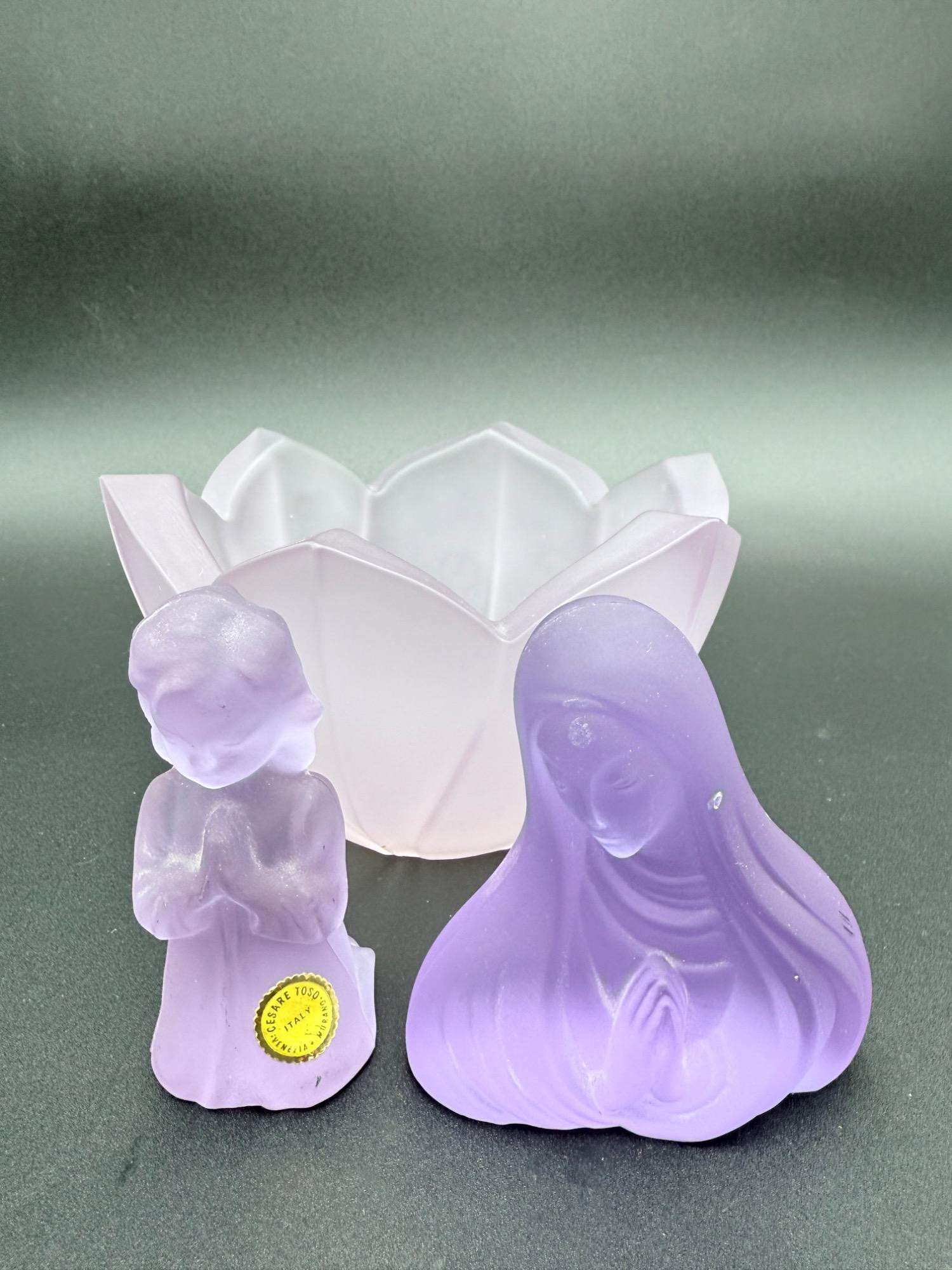 Elevate your decor with this stunning trio of vintage art glass pieces, featuring two elegant lavender figurines from Cesare Toso Murano, Italy, paired beautifully with a delicate Lenox lotus bowl. Each figurine displays exceptional craftsmanship and soft, frosted lavender-purple glass: Cesare Toso Murano Mary Figurine: Cesare Toso Murano Praying Child Figurine: Lenox Frosted Lotus Bowl: Overall Condition: All items are in very good pre-owned vintage condition, showing minor signs of gentle handling and age.