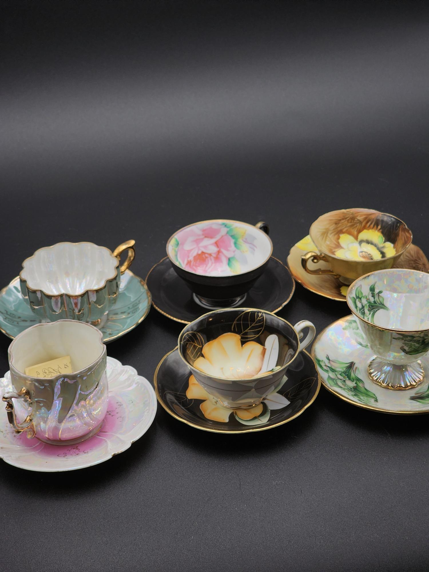 This set of six vintage hand-painted Japanese teacups and saucers features delicate floral motifs, shimmering gold accents, and intricate craftsmanship, making them a perfect addition for collectors, tea enthusiasts, or those who appreciate fine porcelain. Key Features: Condition: Excellent vintage condition with minimal wear.