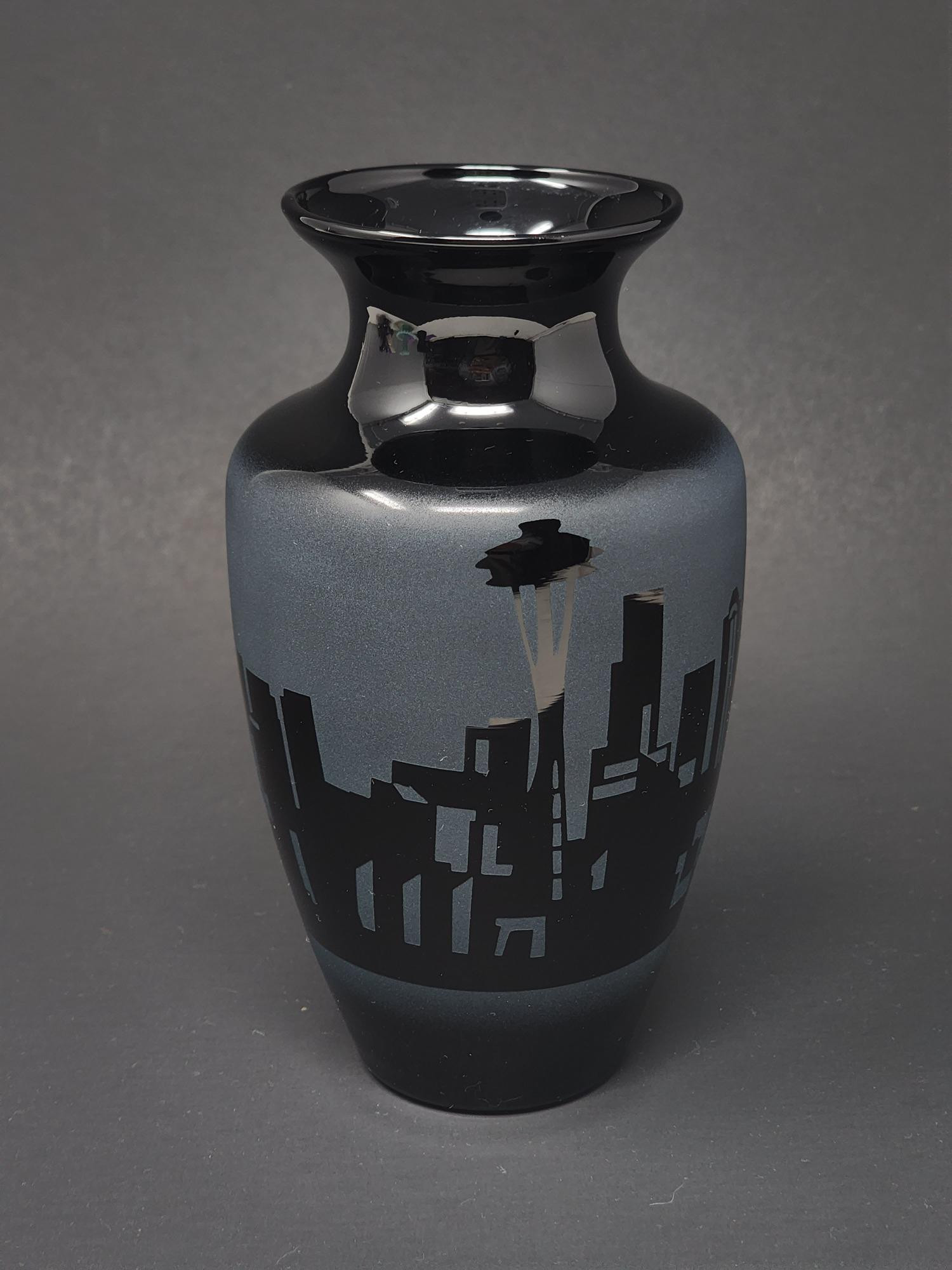 This stunning Kelsey Murphy Pilgrim Art Glass vase is a remarkable piece featuring an intricately carved Seattle skyline with the Space Needle and a breathtaking depiction of Mount Rainier in the background. The contrast of deep black and smoky gray hues creates an elegant, moody aesthetic that enhances the detailed cityscape. Fenton Skyline Series (Unsigned) Fenton did produce some cityscape vases (like the Seattle skyline) in limited runs or for special events, and not all were signed—especially earlier versions or those intended for open retail. The black satin glass with etched silhouette strongly resembles pieces designed by Kelsey Murphy and Robert Bomkamp, even if it's unsigned. These artists are known for carved cameo and skyline silhouettes on satin glass. Features: Condition: Excellent, no chips, cracks, or damage