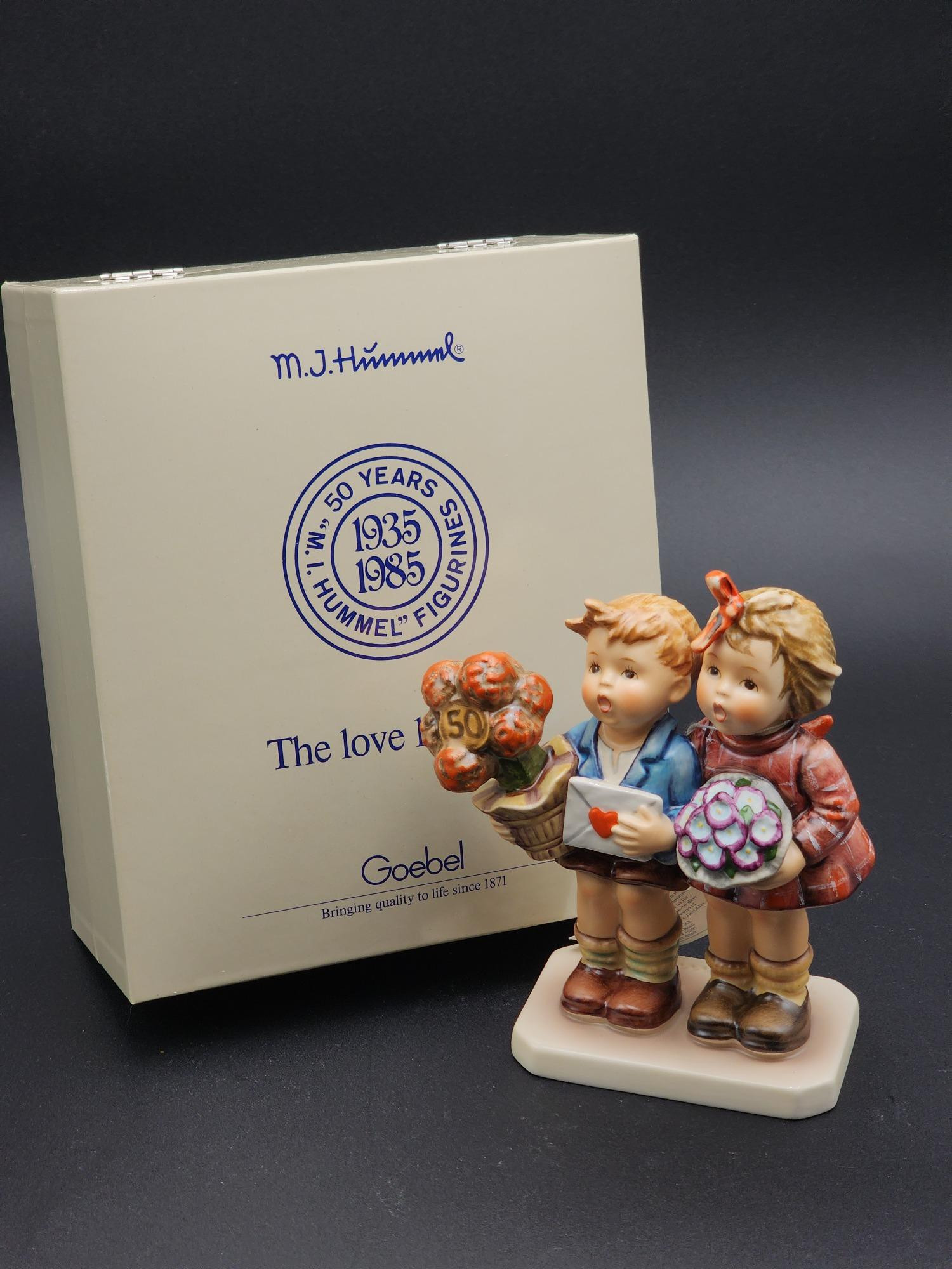 This is a rare Goebel Hummel #416 "The Love Lives On" Jubilee Special Edition, celebrating 50 years of Hummel figurines (1935-1985). Made in West Germany, this beautifully detailed piece captures a heartwarming moment of young love. Item Details: Brand: Goebel Hummel Model: #416 "The Love Lives On" Special Edition: 50th Anniversary Jubilee (1935-1985) Material: Hand-painted porcelain Origin: Made in West Germany Condition: Excellent condition with original box and tag