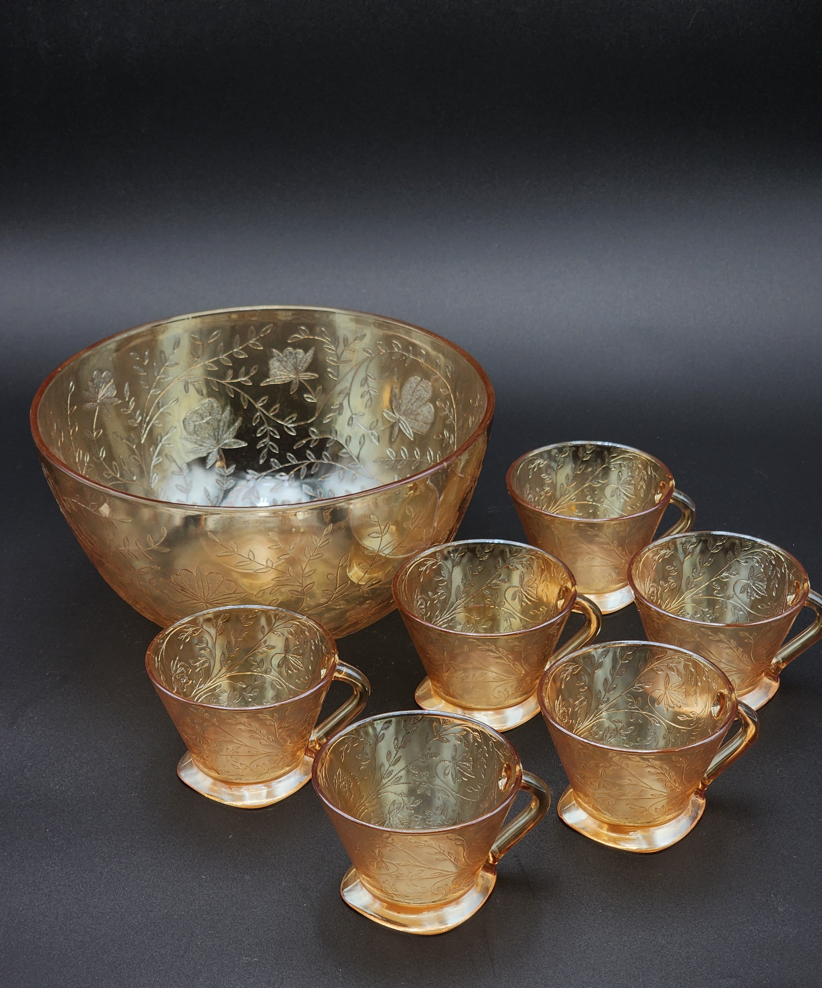 Add a touch of timeless elegance to your collection with this gorgeous vintage Jennette Floragold bowl and cup set. This exquisite Depression Glass set features a stunning iridescent gold finish with an intricate floral pattern, characteristic of the beloved Floragold line. Features: Condition: Excellent, with no visible chips or cracks