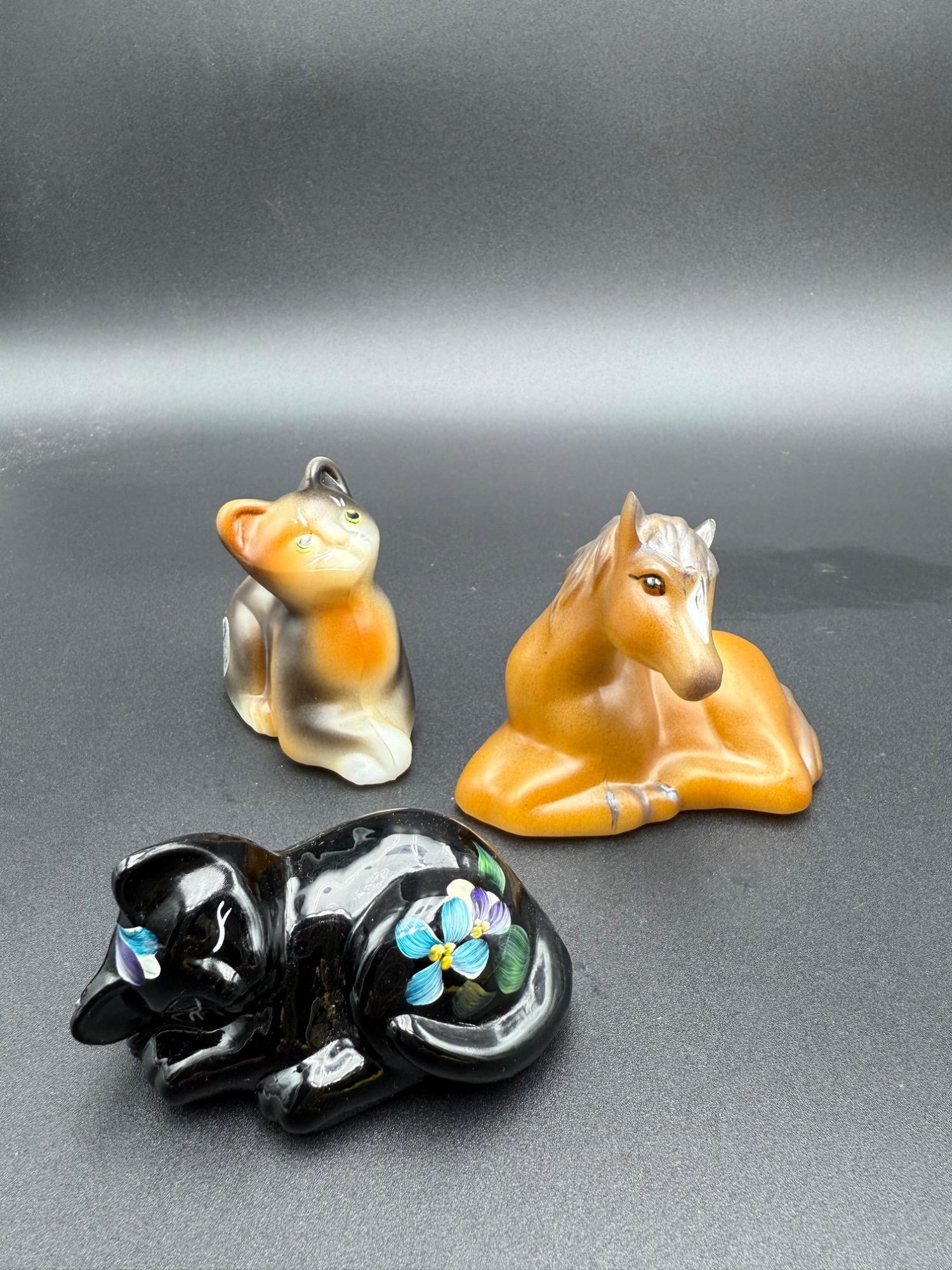 Enhance your collection with this stunning set of three Fenton handcrafted glass figurines, each showcasing exquisite craftsmanship, hand-painted details, and artist signatures. These vintage Fenton pieces are perfect for glass art collectors and animal lovers alike. Included in This Set: Fenton Sitting Cat Figurine - Signed by D. Cutshaw Beautiful airbrushed gradient in warm tones of brown, orange, and black. Marked with the official Fenton sticker and signed by the artist. Original price tag: $35.00. Handmade in the USA. Fenton Lying Down Horse Figurine -Signed by D. Cutshaw A charming tan glass horse with soft painted details. Features the Fenton sticker and an artist’s signature. Handmade in the USA. Fenton Sleeping Black Cat with Floral Design - Signed by CaHall Glossy black glass cat, peacefully curled up. Hand-painted blue and purple floral accents. Signed by the artist and labeled "Hand-painted". Original price tag: $29.50. Handmade in the USA. Measurements: Largest - 3.5" x 3" Condition: All three figurines are in excellent condition with no cracks, chips, or damage.