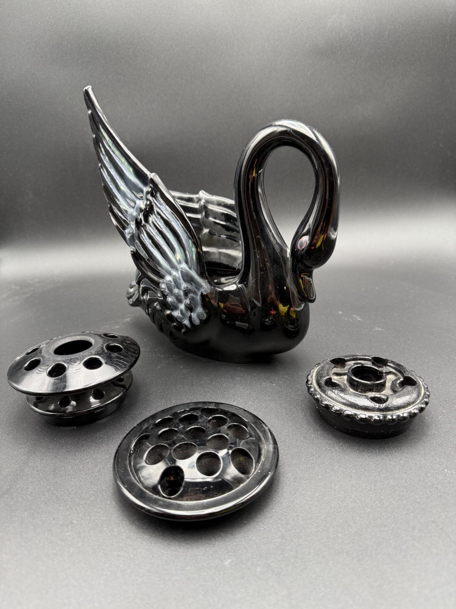 Lot # 174 - Vintage Black Ceramic Swan Vase with Glass Flower Frogs – Art Deco