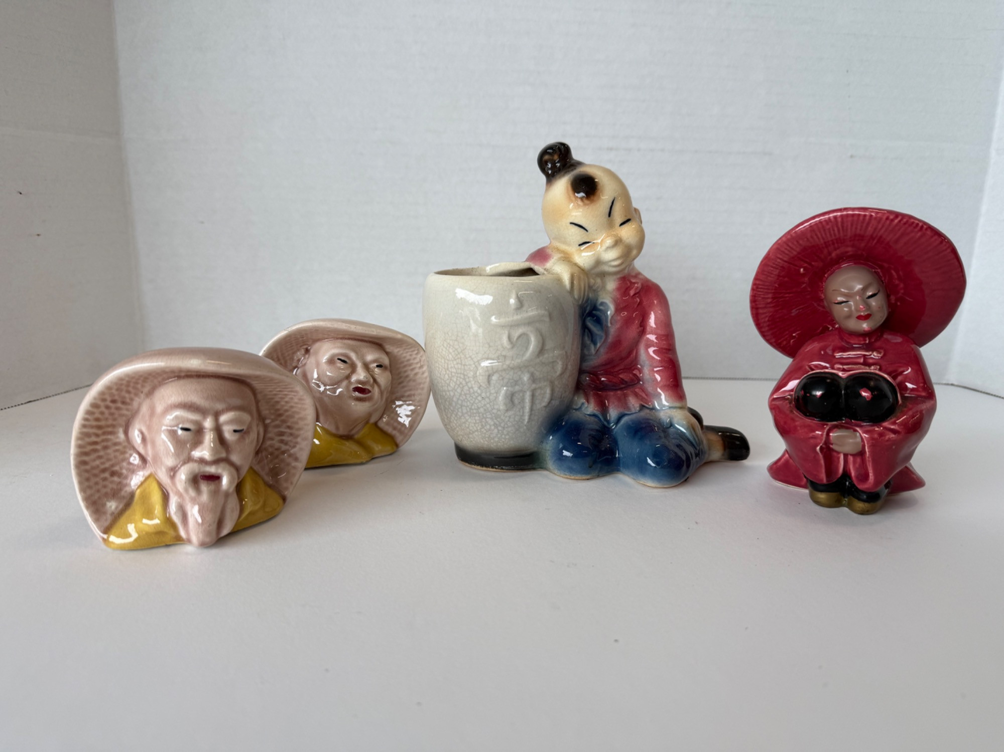 This charming 4-piece vintage ceramic figurine set, marked Royal Copley, dates to the 1950s. The rare collection includes: 1 Seated Boy Figurine in traditional attire, leaning on a ceramic vessel. Stamped "Royal Copley" on the base. 1 Seated Girl Figurine in a red kimono with large black decorative accents, wearing a detailed sun hat. 1 Pair of Salt & Pepper Shakers shaped like elderly Asian figures with hats, inscribed “1950”.