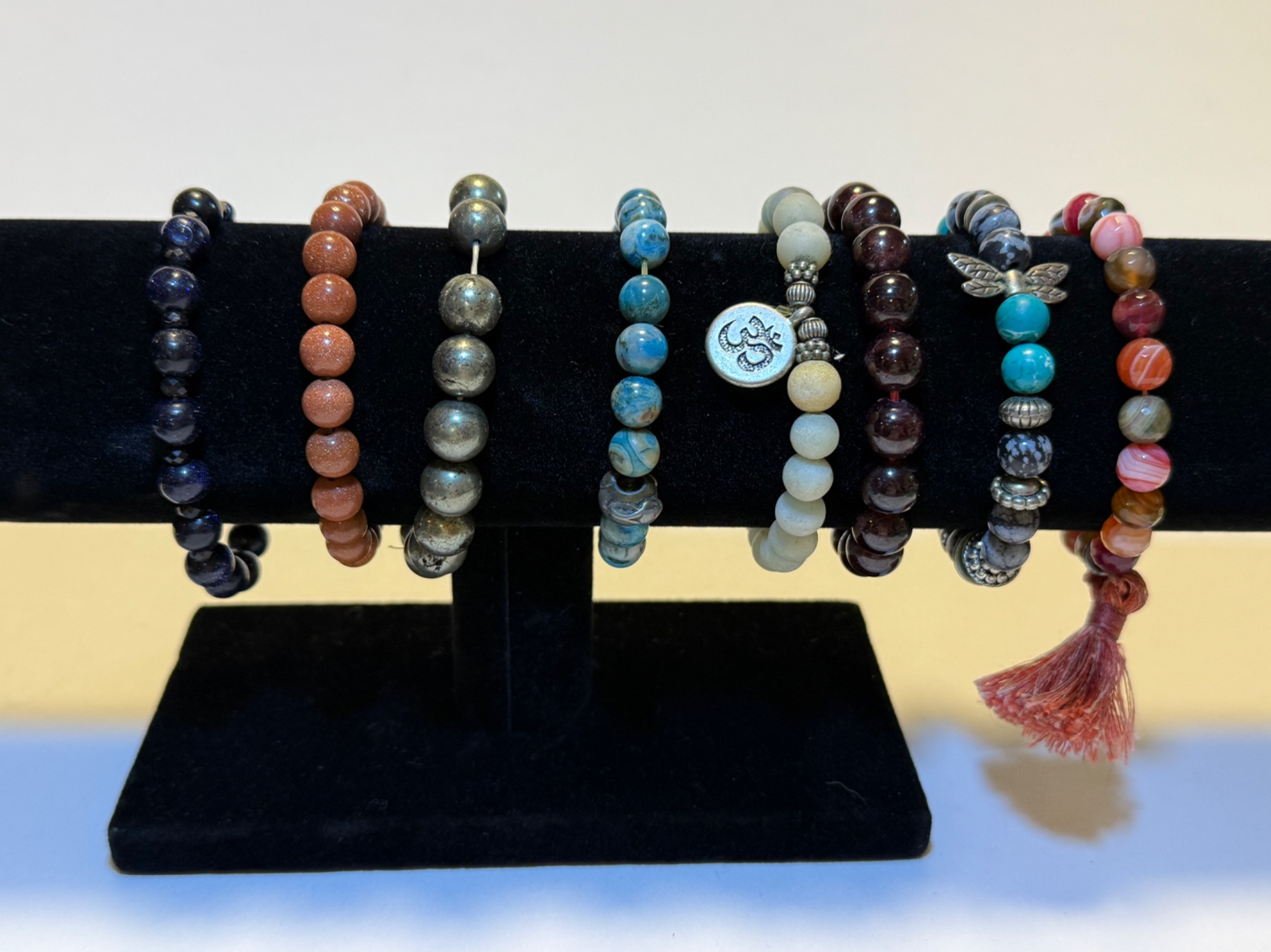 This beautiful collection of 8 handmade gemstone bracelets features natural stone beads and unique accent charms. These stretch bracelets are perfect for everyday wear, yoga, meditation, or adding a boho-chic touch to your outfit. Condition: All bracelets are in excellent pre-owned condition with minimal signs of wear. Elastic cords are intact and stretchy.