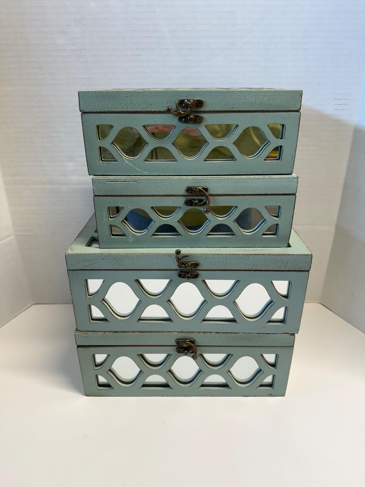 Add vintage charm and practical storage to your home with this beautifully crafted set of 4 decorative boxes. This matching set includes: 1 Large Box: Measures 4.75" H x 12" W x 7.75" D 3 Small Boxes: Each measures 3.5" H x 9.5" W x 6" D Each box features a soft mint green color with a cool undertone, an ornate metal clasp closure, and a glass top adorned with an eye-catching geometric cutout pattern. The see-through design makes them ideal for displaying collectibles, keepsakes, or organizing small items like jewelry, trinkets, craft supplies, and more.