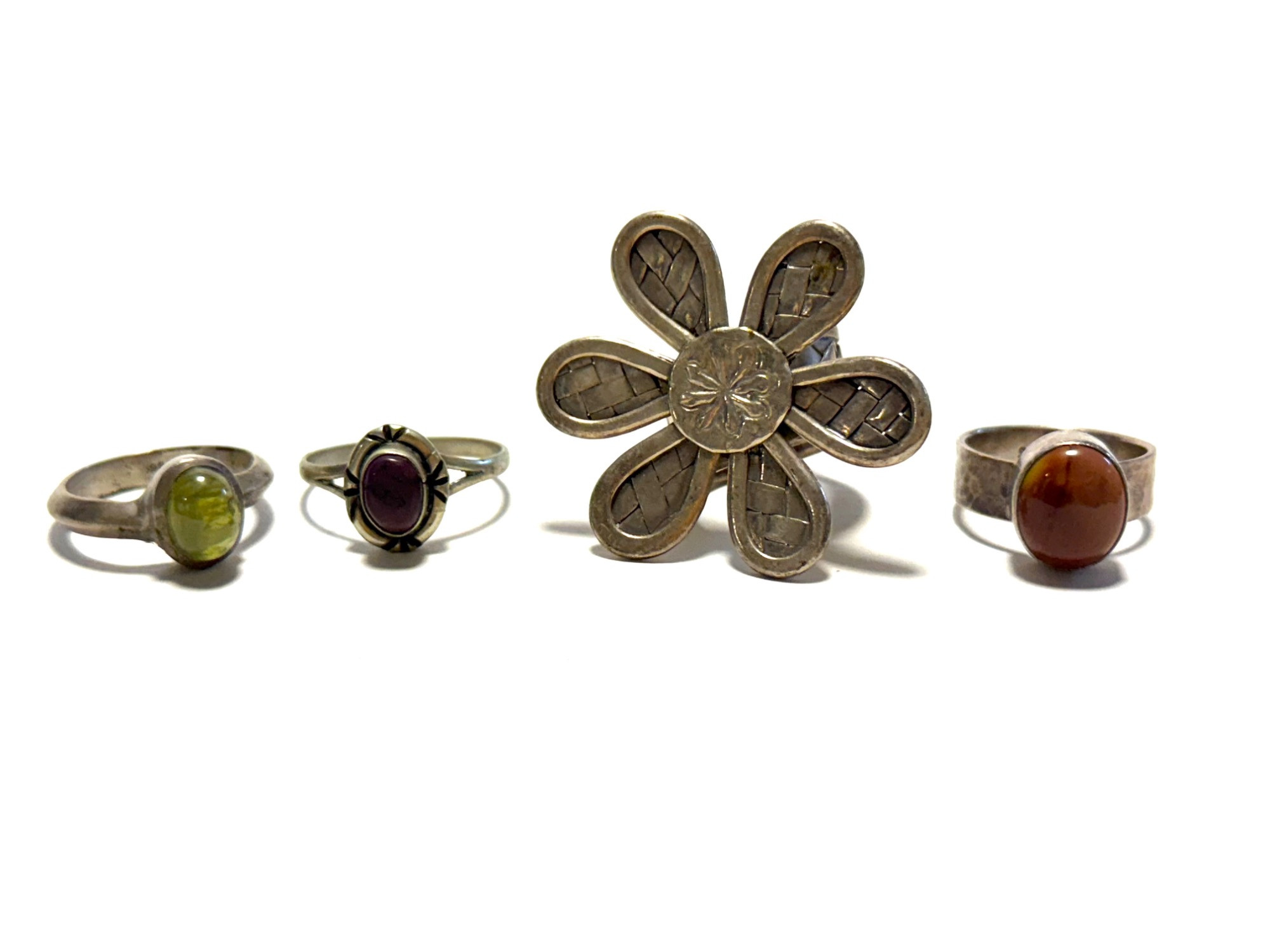 Add timeless charm to your jewelry collection with this curated set of four vintage sterling silver rings, each featuring a unique natural stone: Green Peridot Cabochon Ring Deep Purple Stone Ring Oversized Sterling Flower Ring Rust-Colored Carnelian Ring