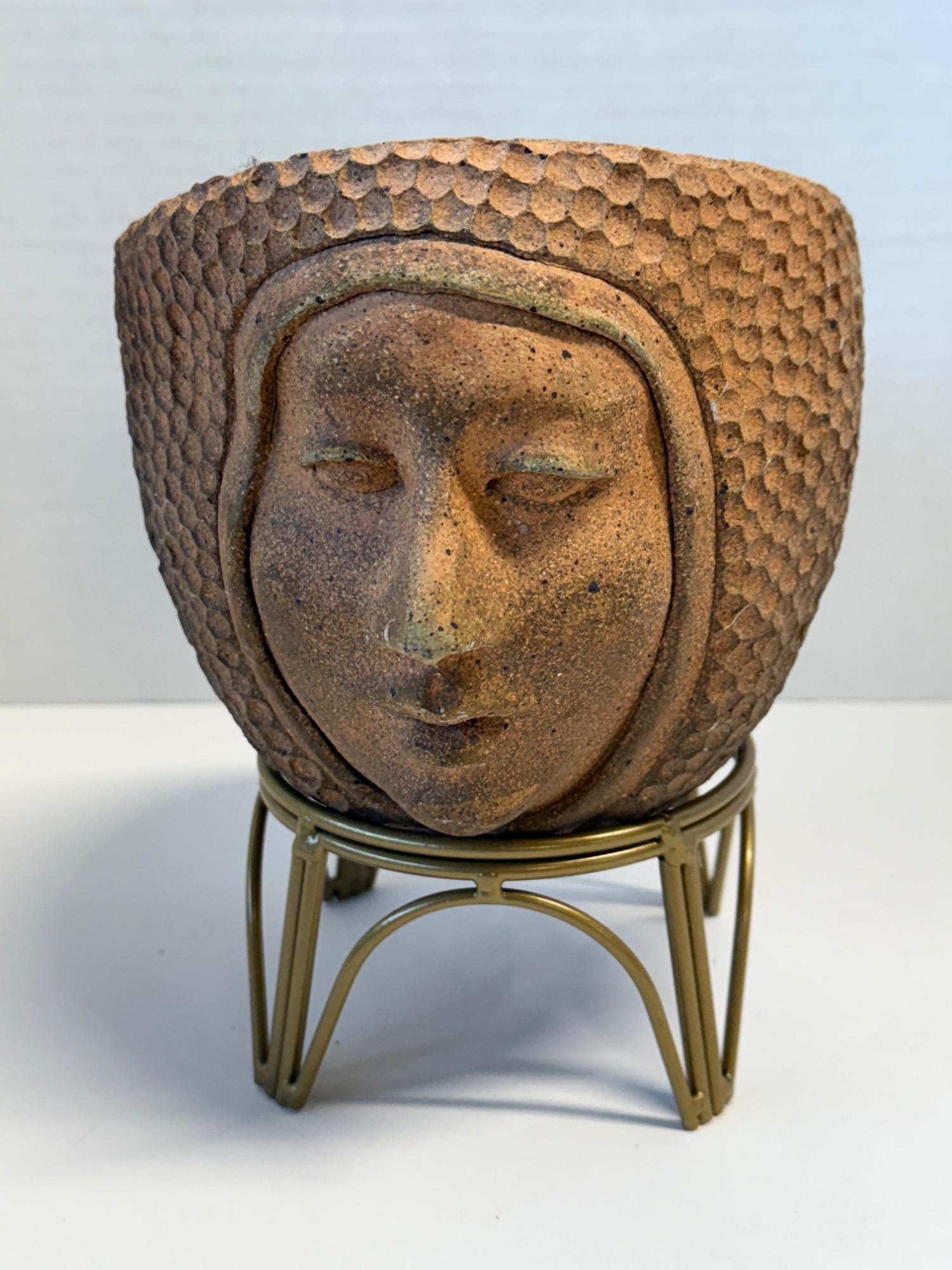 This one-of-a-kind sculptural planter combines earthy charm with an intriguing presence. Handcrafted from textured clay, the pot features a serene, sculpted face emerging from a scale-like honeycomb surface, offering a powerful blend of raw natural texture and human expression. Material: Stoneware/ceramic with textured surface Color: Warm terracotta with natural variations Design: Raised facial sculpture on one side, textured body Includes: Modern gold-toned metal stand Signature/Markings: Stamped with a circular mark on the side (artist unknown) Condition: Excellent vintage/used condition; some natural imperfections from the firing process.