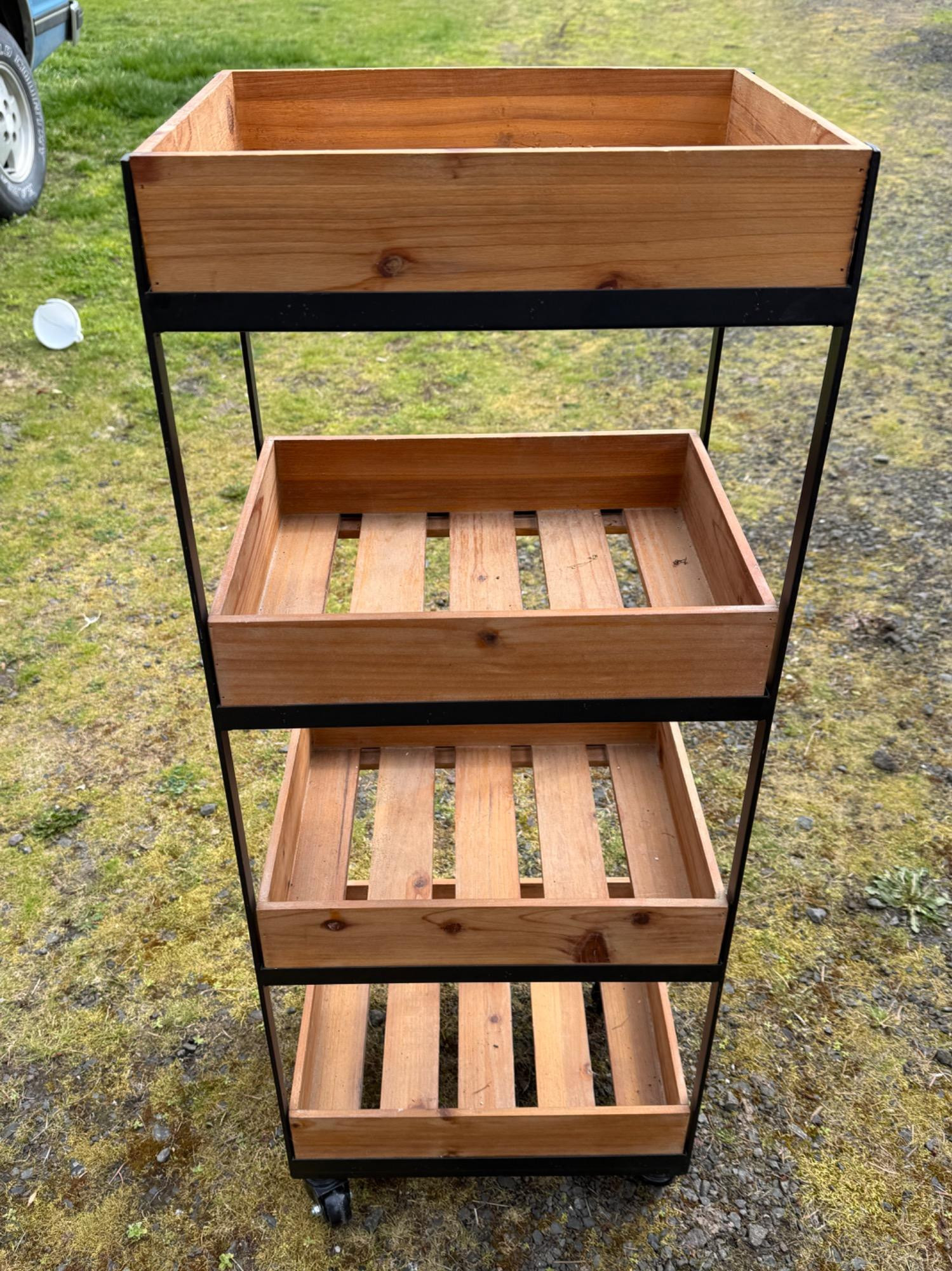 This versatile storage cart features a sturdy black metal frame paired with natural wood shelves for a warm, industrial look. Each of the four spacious wooden crates provides ample storage, with slatted bottoms that add to the rustic charm. The cart is set on four wheels for easy mobility.