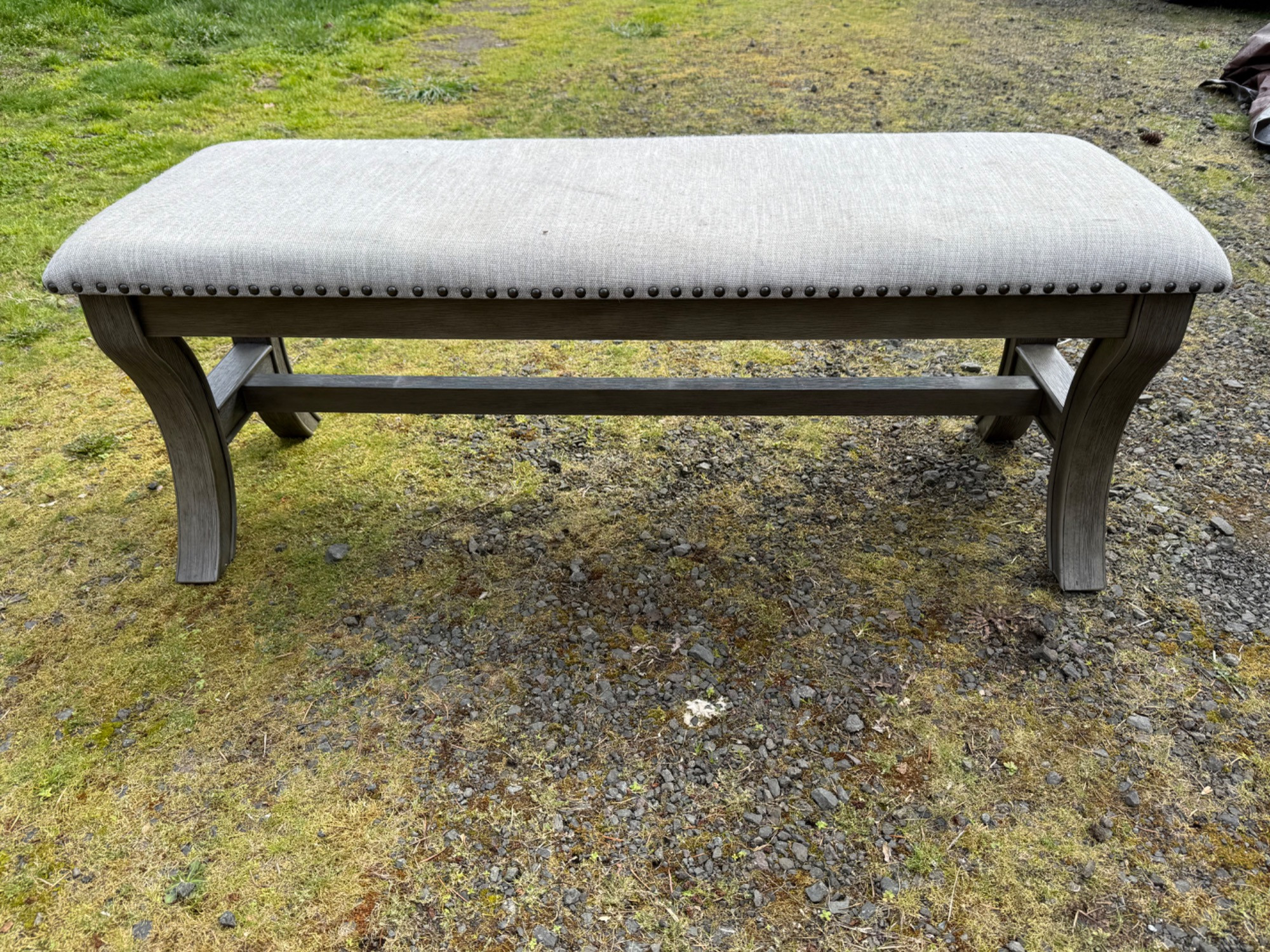 This beautifully crafted upholstered bench brings rustic charm and timeless elegance to your space. The frame features gracefully curved wooden legs in a weathered gray finish, offering a sturdy and stylish foundation. The cushioned seat is upholstered in a soft, neutral-toned fabric and accented with decorative nailhead trim for a refined look.