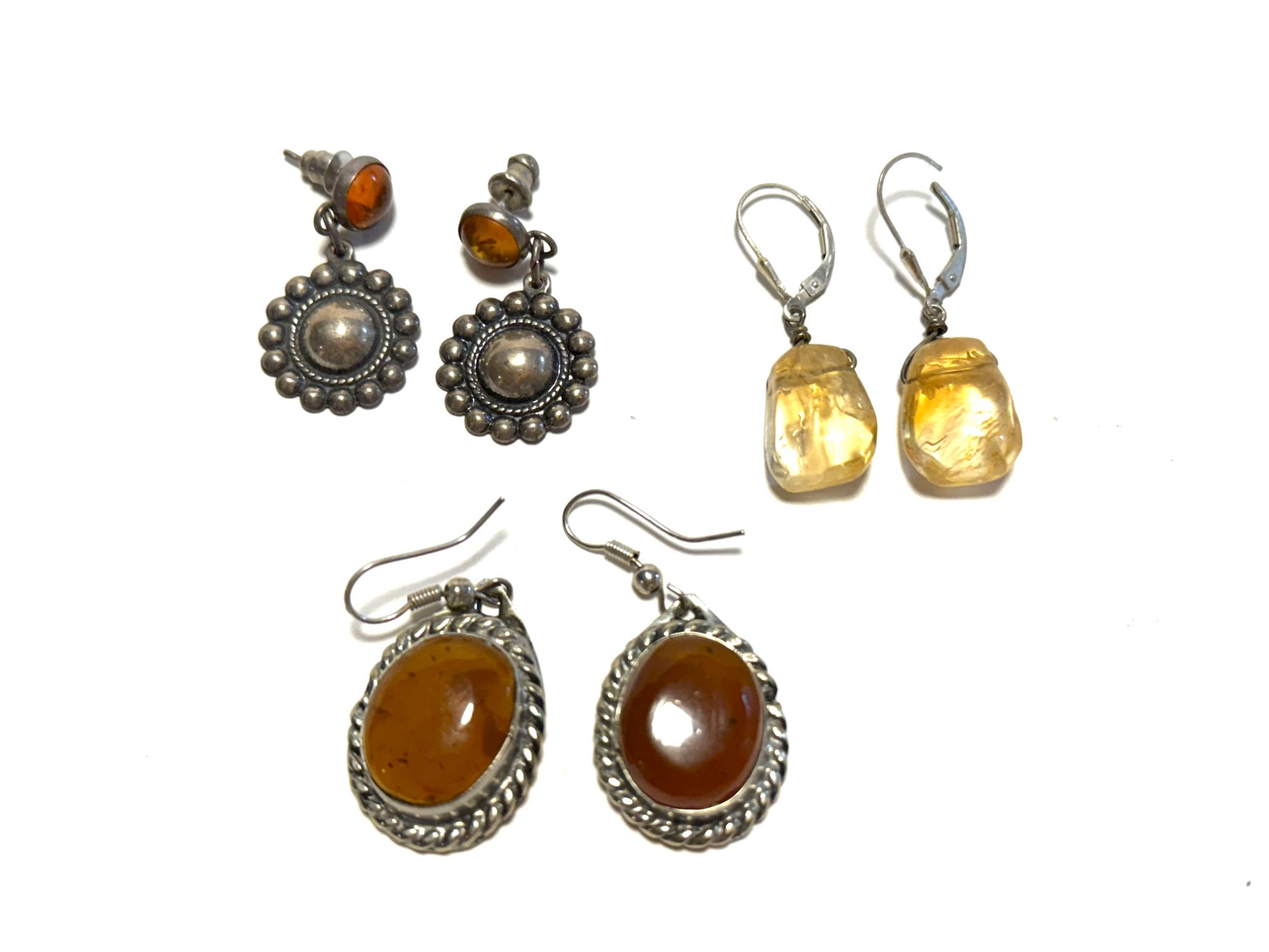 This charming lot includes three pairs of vintage dangle earrings, each measuring up to 1 inch in length: Amber-Tone Floral Drop Earrings – Antique-style sterling silver floral design with beaded detailing and a warm amber-tone cabochon accent. Golden Citrine Dangles – Translucent, irregularly-shaped citrine-like stones with lever-back hooks for secure wear. Oval Amber Cabochon Earrings – Rich amber-colored stones set in twisted sterling silver frames with fish hook ear wires. Condition: All earrings are in well preserved.