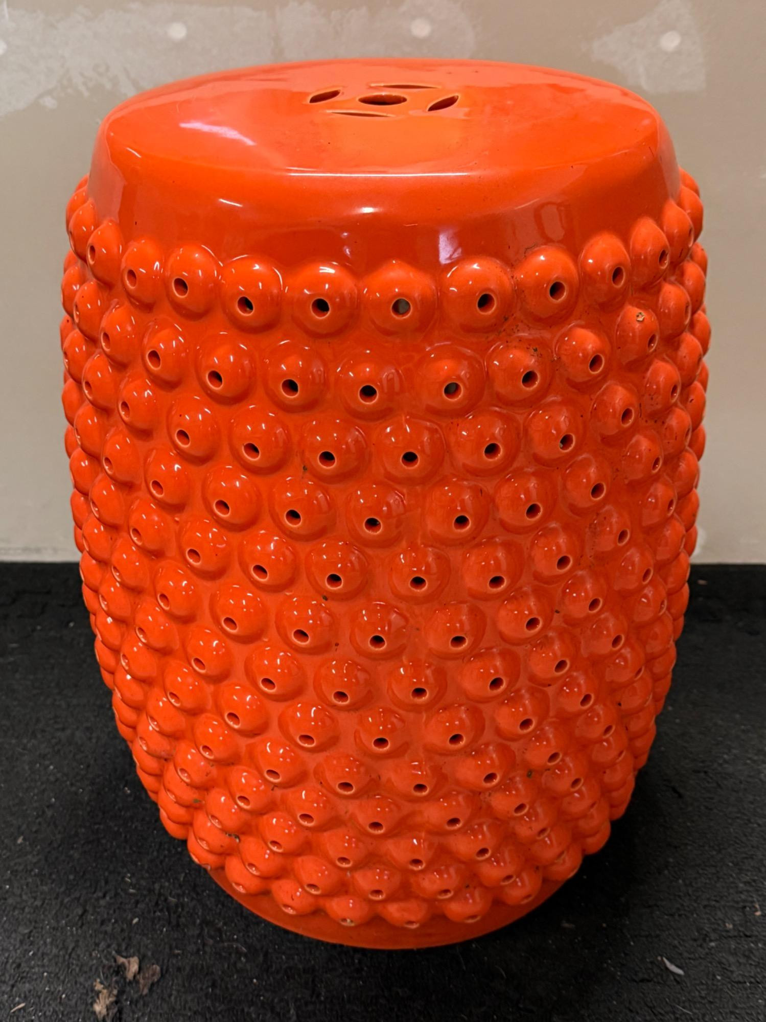 Brighten up your indoor or outdoor space with this vibrant Safavieh Orange Garden Stool. This eye-catching ceramic piece features a bold orange glaze and a unique raised dot texture that adds a modern twist to a traditional garden stool silhouette. Its versatile design makes it perfect as a side table, plant stand, or extra seating. Brand: Safavieh Color: Bold orange Material: Glazed ceramic Design: Textured hobnail-style surface with decorative cutouts on top Condition: Pre-owned; shows signs of wear including surface marks and minor