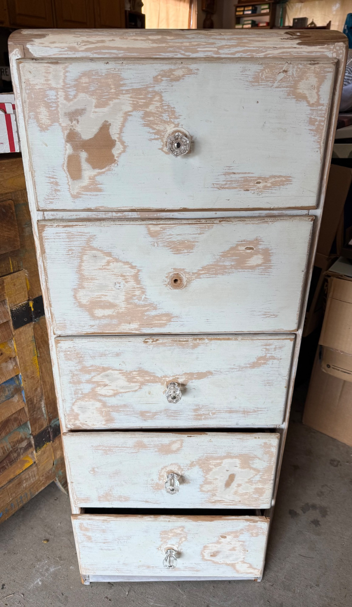 Add some rustic charm to your space with this tall, vintage-style chest of drawers. Featuring a distressed white finish, it has 6 drawers with clear glass knobs that complement its shabby chic look. Perfect for a bedroom, craft room, or hallway. Condition Note: Structurally sound. One knob needs a new screw (included inside the drawer). Distressed paint finish adds character, or can be refinished to your taste.