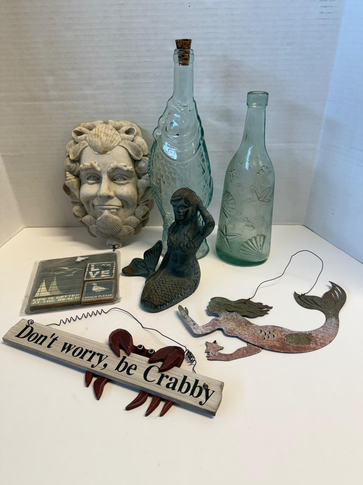 Mermaid is cast iron. Measures 6.75” tall. Face with shells is resin