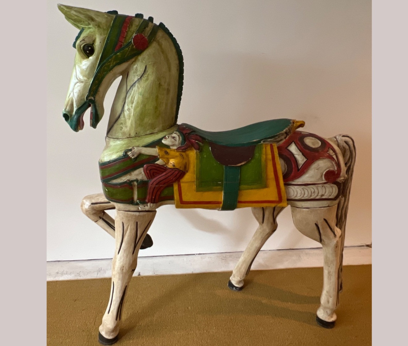 Hand painted antique full size carousel horse with delightful jester jockey and eagle head saddle seat. Carved from wood. Removable head, legs and tail. Some cracks in wood torso and prancing leg due to age. Circa 1900-1920s. Bidding on this lot is an agreement that: (1.) You will have 2 capable, able-bodied persons to lift and load at a minimum. (2.) You