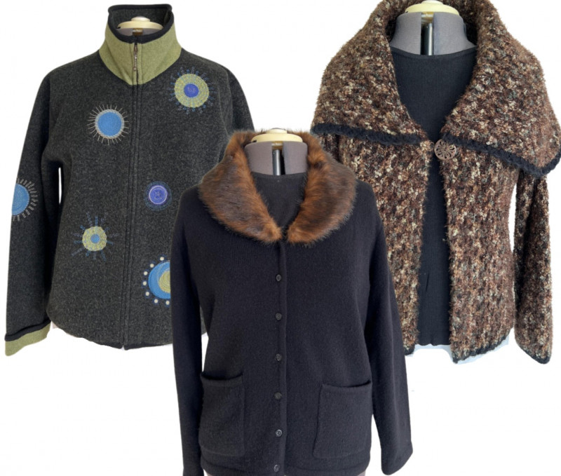 Vintage cardigan style jackets: Emma James sweater with fur collar (removable) - Size Medium, Icelandic Design Wool jacket - Size Large, and Marissa Christina shawl style sweater - Size Large.