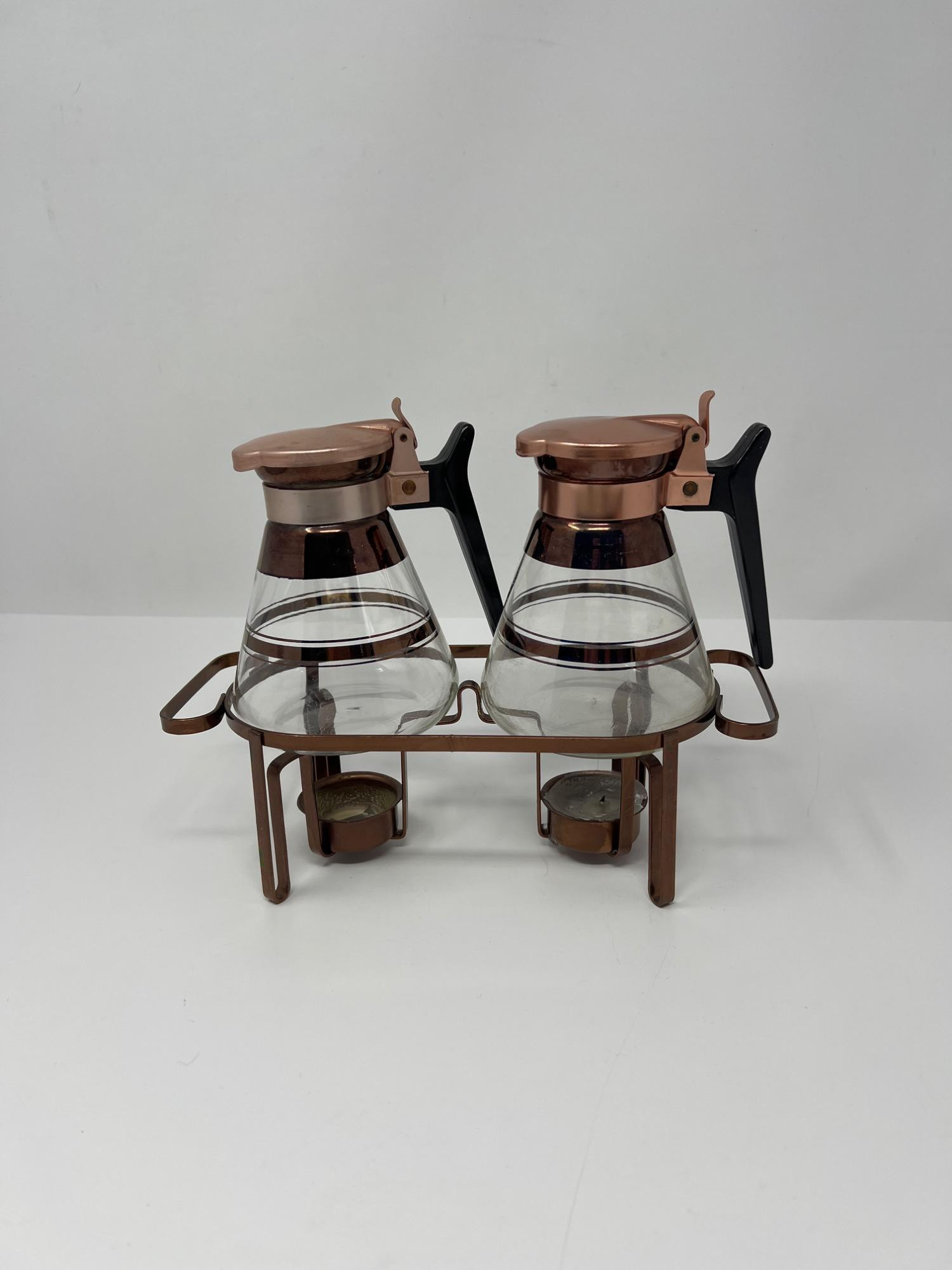 Mid century carafes to warm syrup for pancakes and/or waffles. Glass with copper tops. Carafes measure 5.5” tall x 4” round Overall