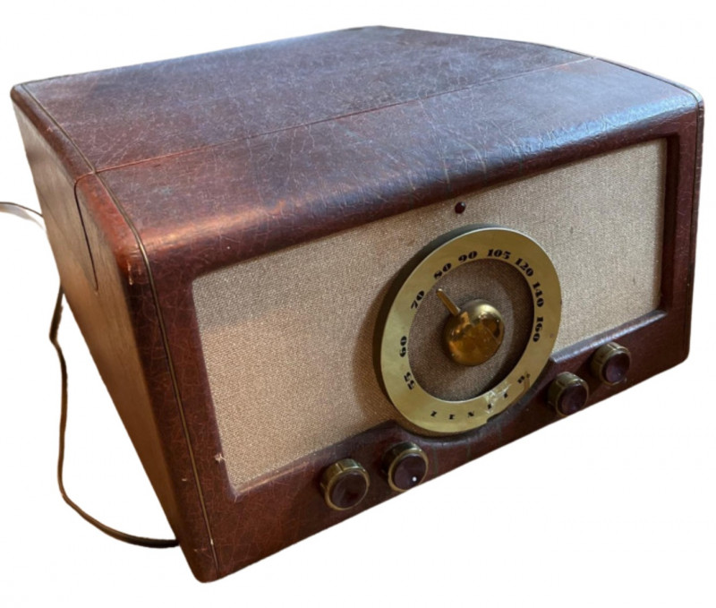 Antique model of Zenith electronic AM/FM radio and loop antenna. Radio functions. Phonograph spins. Otherwise, no further testing. Click here for more information about Model H661R Ch= 6H01 - Zenith Radio Corp.; Chicago. S-17475