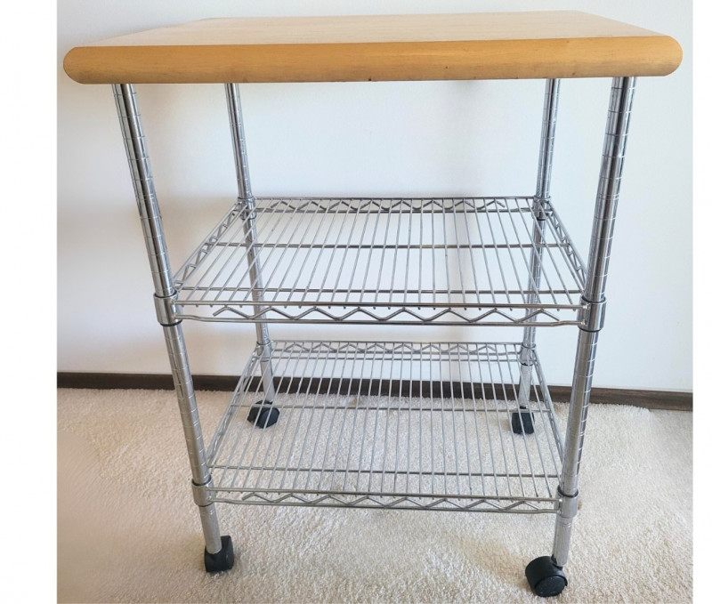 Wood butcher block top, chrome frame with locking wheels. Two racks underneath.