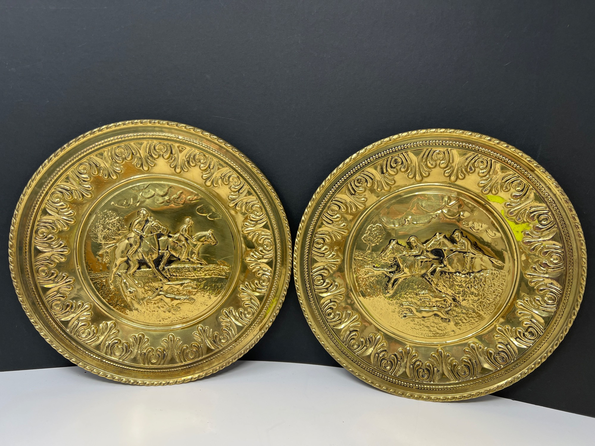 These vintage brass plates are embossed with fox hunting scenes, showcasing intricate craftsmanship. Made in England, these plates are a fine example of traditional decorative art. Their embossed design adds texture and depth, making them visually striking and perfect for wall display. Measuring 12 inches in diameter, they are a charming addition to any vintage or rustic-themed décor.