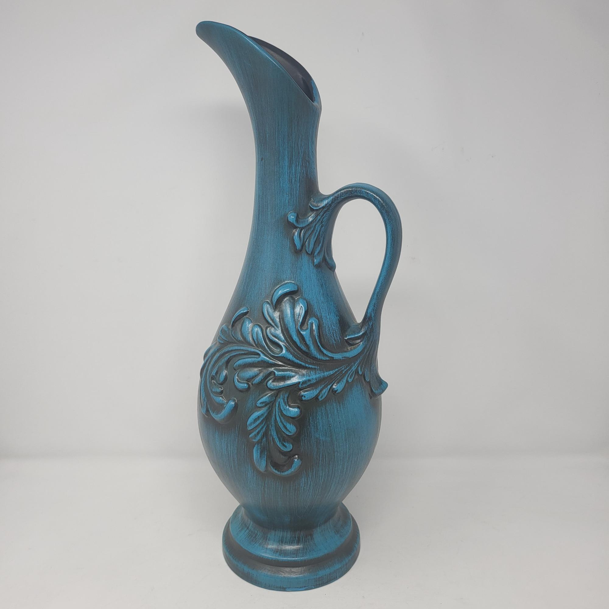 The Haeger vase features a teal and black brushed look with a raised leaf motif. It has a handle that accents the decorative and functional potential of the vase. Marked "Haeger 8097 U.S.A.".