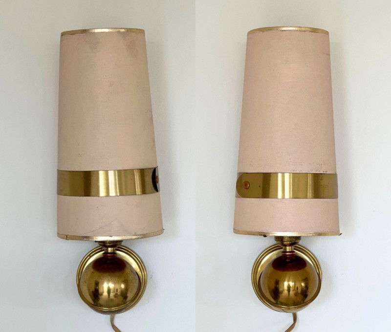 Two mid-century modern brass fixtures with an elegant, minimalist design. Conical beige lampshades, combined with brass trim and brass spherical base, give these lights a balanced and elongated appearance without dominating the wall space. The lights are working and simply plug into a wall outlet. Push on/off switch. Original shades that have some smudges to the surface.