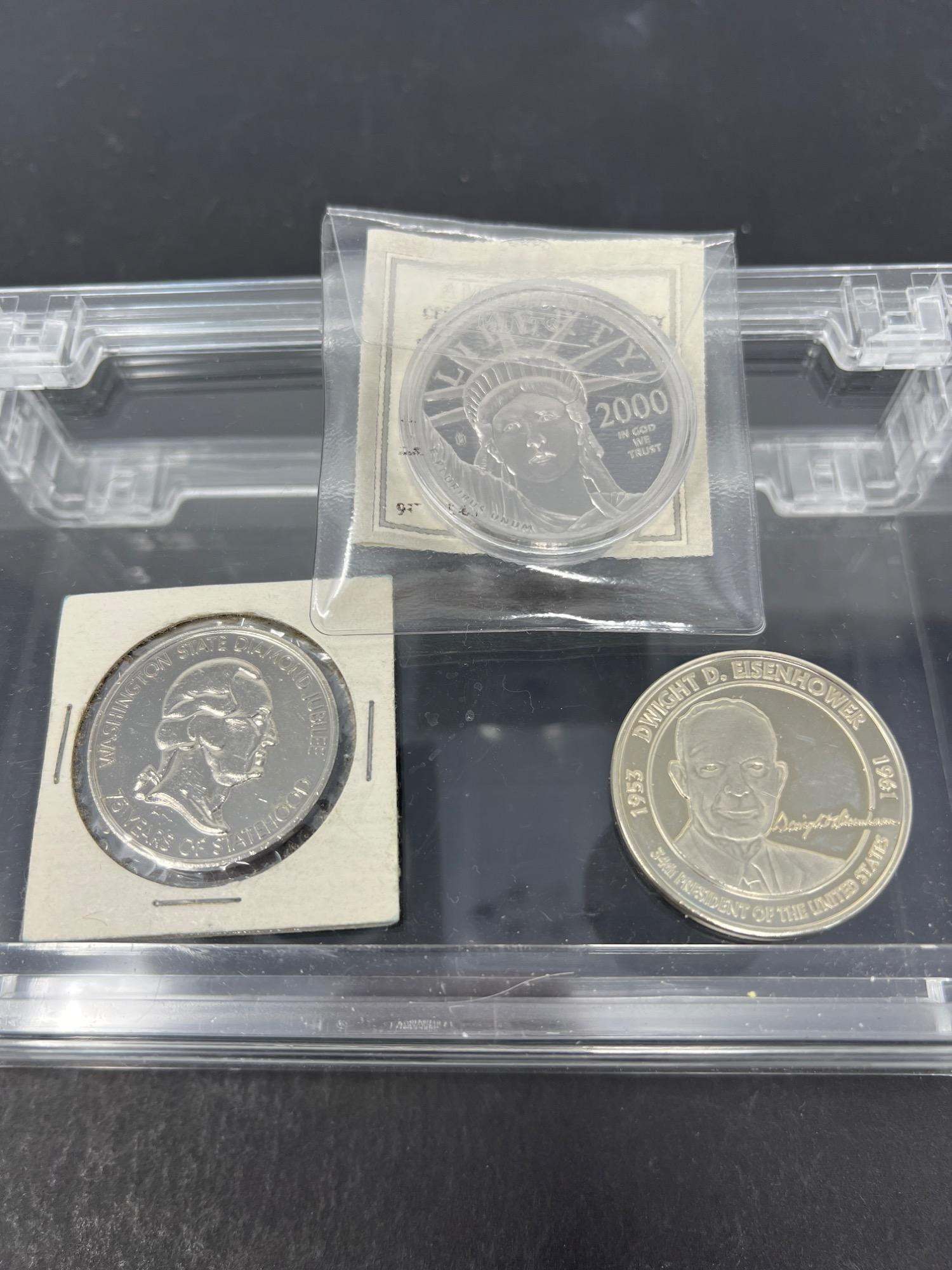 Liberty coin is dated 2000. Issued by American Mint, issued in 2011, $100 Eagle Replica. Cu Platinum layered. Washington State Diamond Jubilee 75 Years commemorative coin. Eisenhower 34th Anniversary Coin