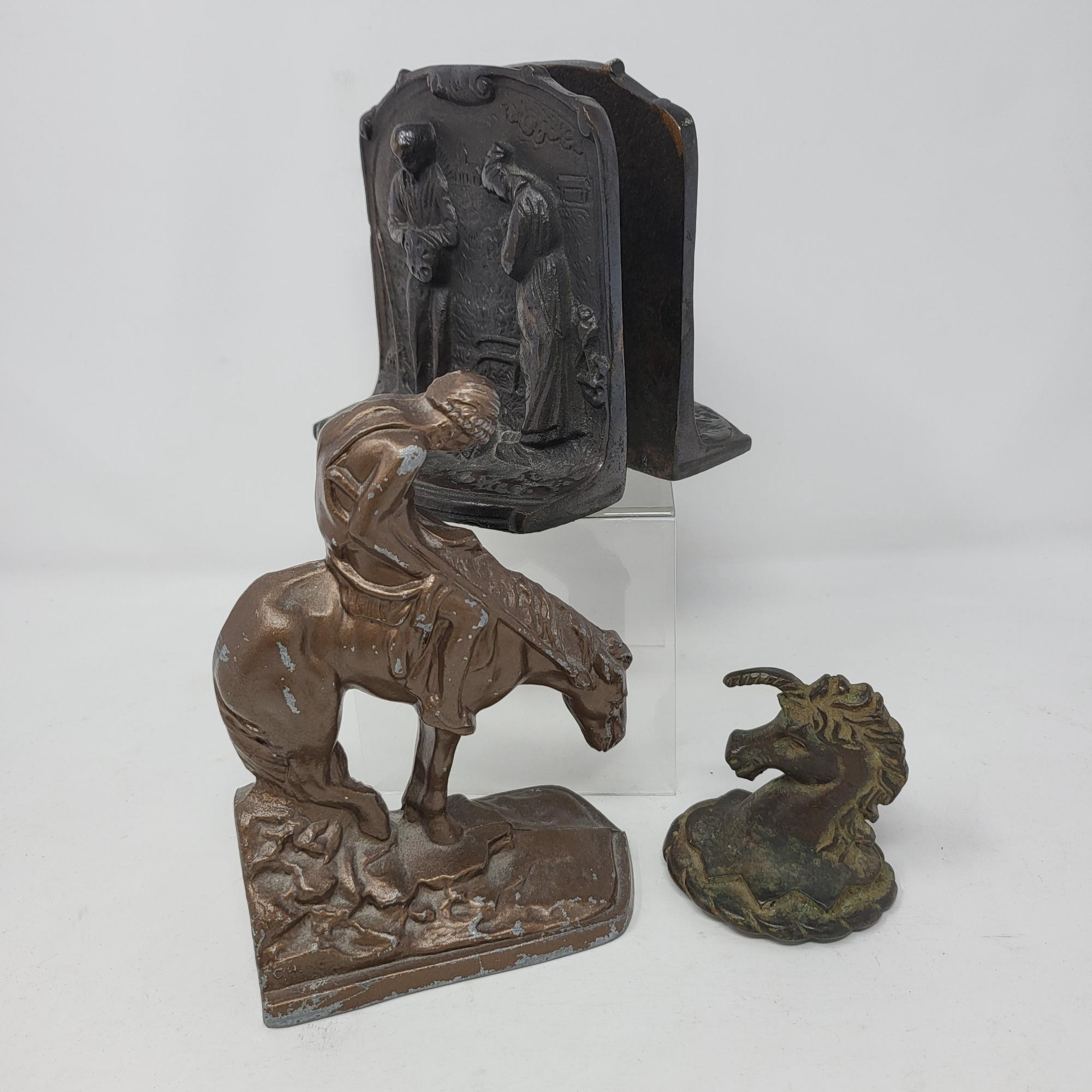 Lot # 65 - Antique Cast Iron Preyer Bookends, End of Trail Statue & Unicorn Hook