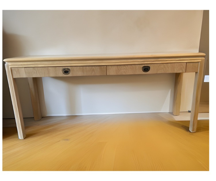 This blonde solid wood sofa or hallway/entry table is a Drexel Heritage Rectangular Table #16791. Drexel Heritage is known for its high-quality craftsmanship and timeless designs. The table has clean lines and a versatile design. It includes two drawers with original metal drawer pulls. See Lots 90 and 85 for additional furniture pieces from the same vintage Drexel Heritage collection. Located on a ground floor level, no steps. Bidding on this lot is an agreement that: (1.) You will have 2 capable, able-bodied persons to lift and load at a minimum. (2.) You