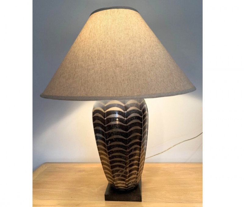 Jay Spectre has a distinctive design that blends modernism with Art Deco influences. Spectre, an acclaimed American designer, was known for his luxurious and sophisticated creations, often incorporating sleek lines, rich materials, and bold geometric shapes. His lamps are not just functional lighting pieces but also artistic statements that elevate any space. This lamp was designed for Paul Hansen. It features a striking combination of materials and textures, such as lacquered steel, ceramic, or nickel. These lamps were crafted with meticulous attention to detail. Base is 6 inches x 6 inches. Shade is 14 inches height x 22 inches diameter at bottom. Overall: