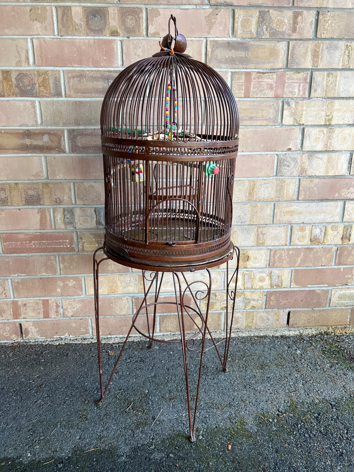 Bird cage has removable tray at bottom for ease in cleaning. Hinged door. Includes iron stand. Cage has weight (vintage to antique). CAGE: 23 inches height x 17 inches diameter STAND: 25.5 inches tall x 17.5 inch diameter OVERALL: