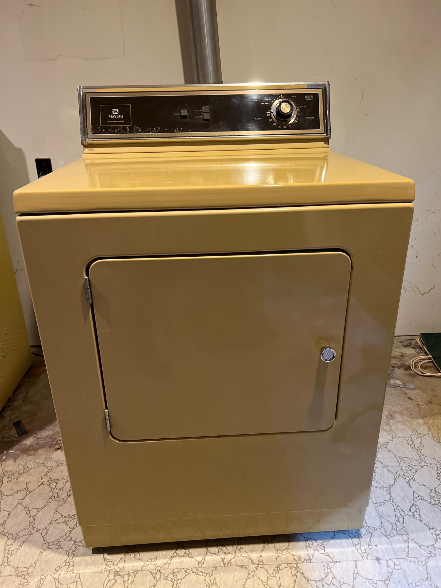 Maytag dryer in working condition. Age of dryer may be 1980s or as late as 2006. Serial: 187553NC, Model #801 412. Inside clean, normal wear/tear to exterior. Note cosmetic issue with instrument panel (bubbling to surface at left). Bidding on this lot is an agreement that: (1.) You will have 2 capable, able-bodied persons to lift and load at a minimum. (2.) You