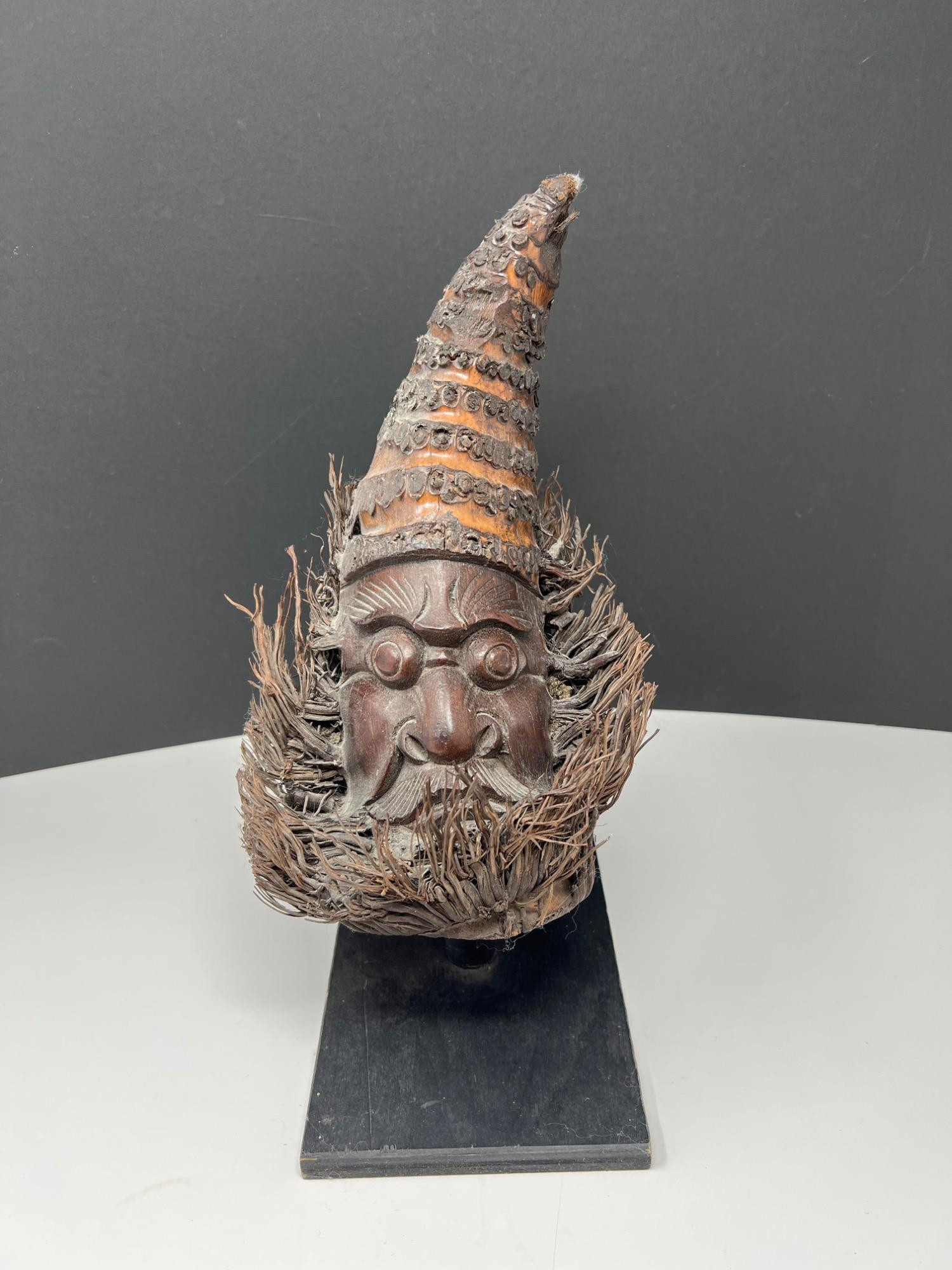Crafted from bamboo root depicting older man. Sits on wood posted platform. Intricately carved.