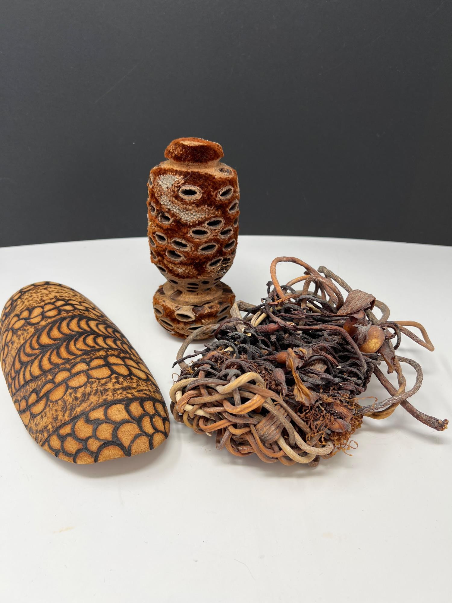 Carved Australian Banksia Seedpod Vase - 7 inches height x 3 inches round Australian Aboriginal Carved Wooden Coolamon Bowl - 11 inches length x 3 inches wide (signed) Bull Whip Kelp (Oregon, USA) - 9 inches long x 7 inches wide