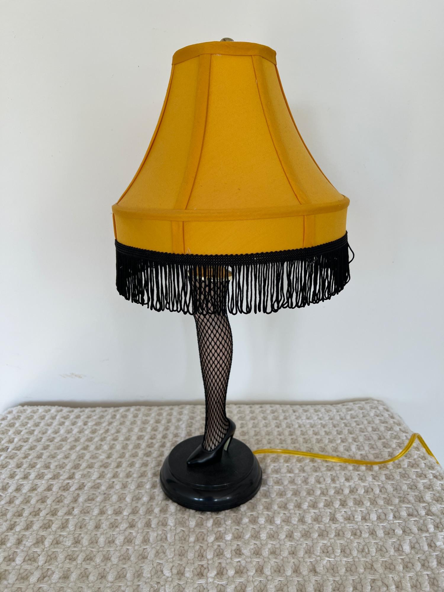 This lamp is a quirky and iconic piece, famously known as the Leg Lamp from the movie A Christmas Story. It is designed to resemble a woman's leg wearing fishnet stockings and a black high-heeled shoe, topped with a yellow lampshade with black fringe. The lamp is celebrated for its distinctive and humorous design, embodying a playful and nostalgic charm. It's often associated with holiday decor and adds a touch of whimsy to any space. This lamp is stamped Sun-Lite, made in China. Most likely a replica.