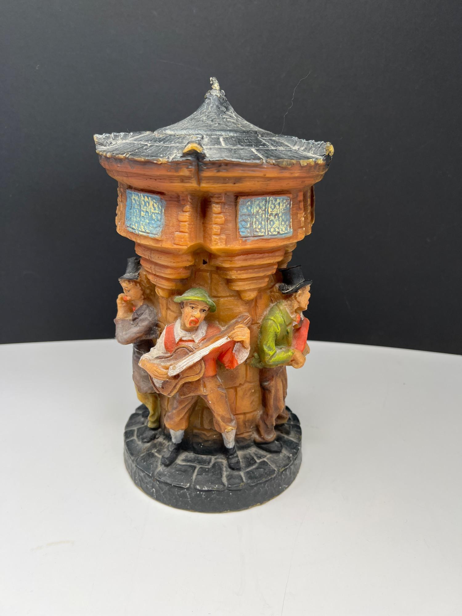 Delightfully intricately carved wax candle by Gunter of Germany. Top of roof removes to insert a tea lite. Depicts street musicians entertaining villagers.