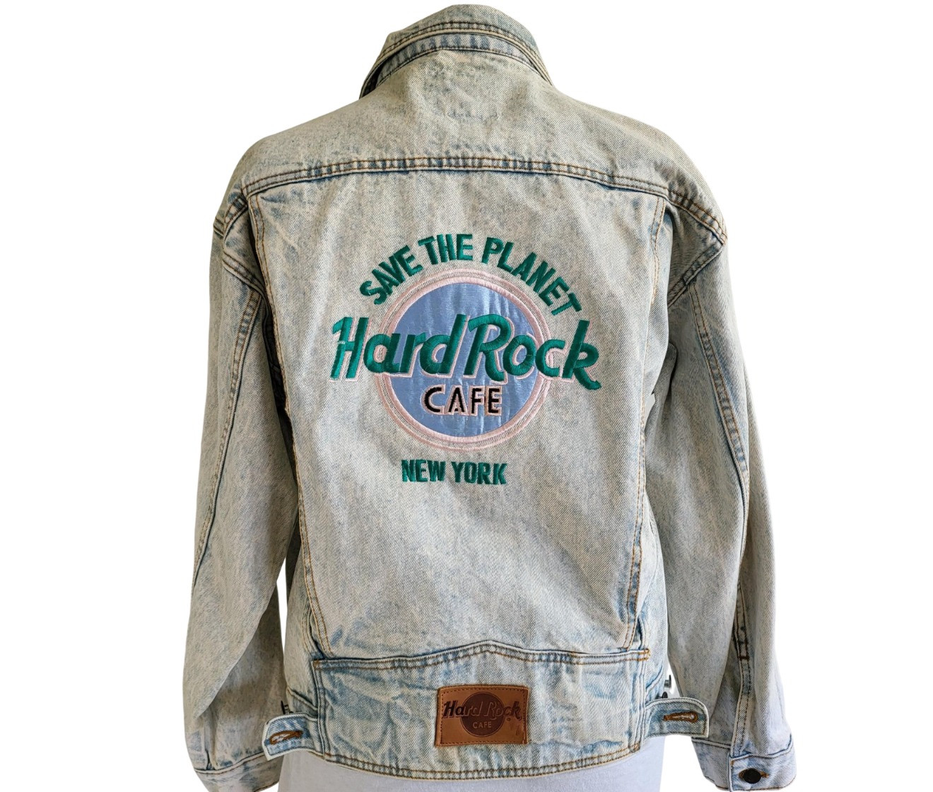 100% cotton, Made in Taiwan, vintage acid wash jeans Hard Rock Cafe, New York, jacket. Women's size MEDIUM.