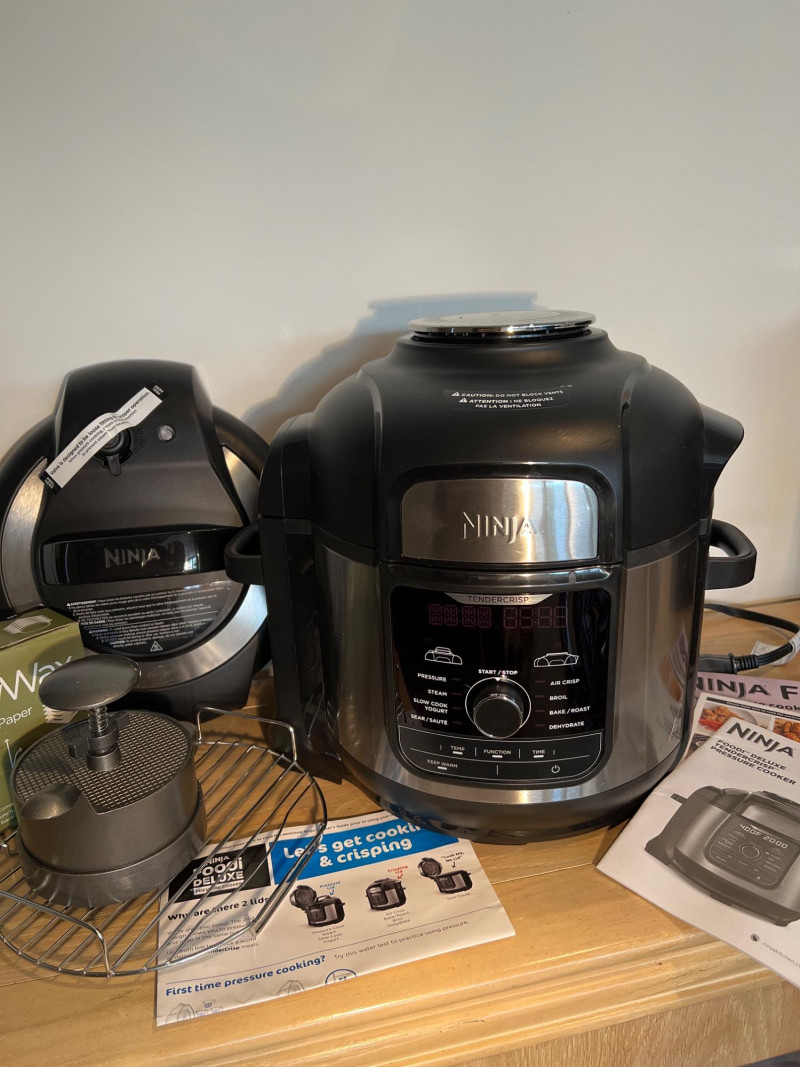 The Ninja FD401 LP3 is an 8-quart deluxe pressure cooker and air fryer, part of the Ninja Foodi series. It offers 12-in-1 versatility, allowing you to pressure cook, air fry, steam, slow cook, sauté, bake, roast, broil, dehydrate, sous vide, and more. Its TenderCrisp Technology lets you quickly pressure cook ingredients to lock in juices, then finish with a crispy, golden air-fryer texture. This model includes an extra-large ceramic-coated pot that is nonstick and easy to clean, along with a 5-quart Cook & Crisp basket for air frying. It also comes with a deluxe reversible rack for steaming and broiling, making it ideal for preparing meals for large families or gatherings. Hardly used or not ever used. Includes patty maker and box of patty wax. Cooking lid and crisping lid.