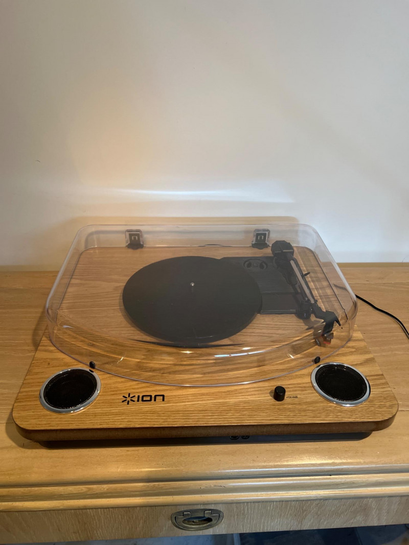 The Ion Max LP is a versatile turntable with a natural wood base that adds a touch of elegance to its design. It's an all-in-one record player that supports three playback speeds (33 1/3, 45, and 78 RPM), making it compatible with a wide range of vinyl records. One of its standout features is the USB connectivity, which allows you to digitize your vinyl collection using the included EZ Vinyl/Tape Converter software. It also has an auxiliary input for connecting other audio sources, such as cassette players or CD players. Used. Powers on. No further testing.
