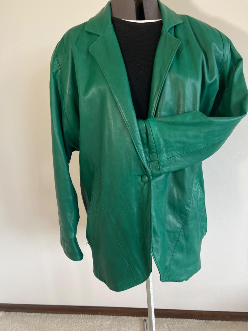 Vintage 1980s or 1990s emerald green leather jacket, made by Erez, U.S.A., known for leather designs from that era. This jacket features a single-button closure, notched lapels, and a relaxed fit with some shaping at the waist. It is made from a soft, supple leather, showing some natural imperfections and creases, which are characteristic of genuine leather. Slightly oversized silhouette and bold color. Fully lined with side pockets. Women's Size Medium.