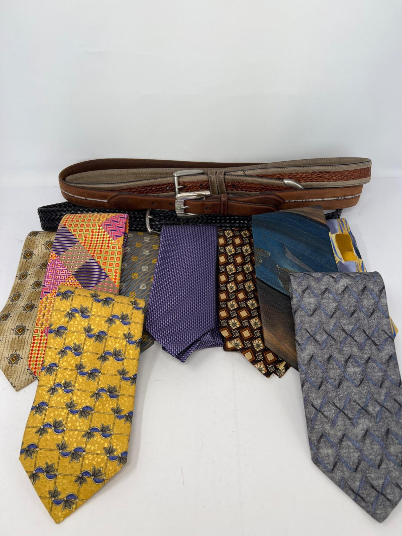 Nine finely fashioned vintage neckties with most of them 100% silk. Robert Talbot and Robert Talbot Studios, Nordstrom; Joseph Abboud; J Garcia Wetlands 1; Canali; Zegna; Robert Daskal signed. Belts - Crookhorn - handmade leather in USA (36); Brown Leather (unknown brand) (38); and Tommy Bahama (40).