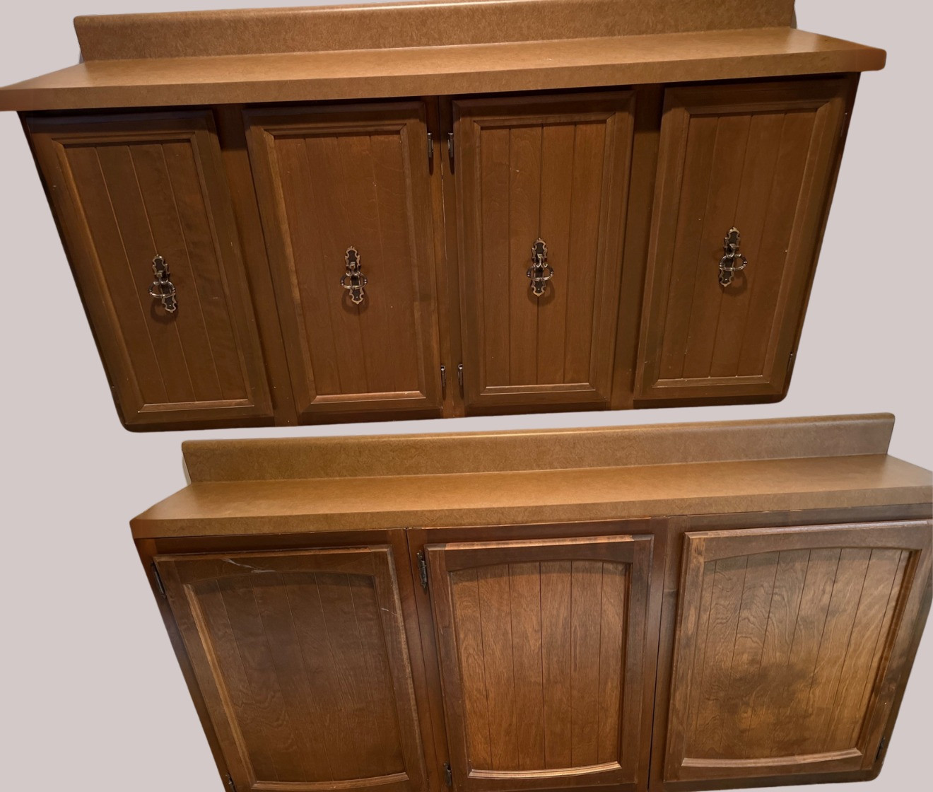 The cupboard section with four doors and metal hardware is one piece. Counter top is secured to base. Cabinet has two cupboard sections accessible from left and right opening hinged doors. The length of the cabinet is 60 inches long. Depth 13.75 inches. Height to counter top is 31.25 inches (height to top of built-in back splash or molding is 35 inches). The other cupboard section is in 3 sections and the counter top is loose (it can be removed). There are 3 hinged doors and each door opens to an individual storage section. The height of the cupboards are 30 inches (31.25 inches height with counter top). Two (2) sections measure 21 inches wide and 13.5 inches depth. One (1) section (far right) is 24 inches wide. Wood construction. Excellent vintage styling. Cabinets currently being used for basement storage along a hallway. Located on ground level with access to driveway load on same level. Bidding on this lot is an agreement that: (1.) You will have 2 capable, able-bodied persons to lift and load at a minimum. (2.) You