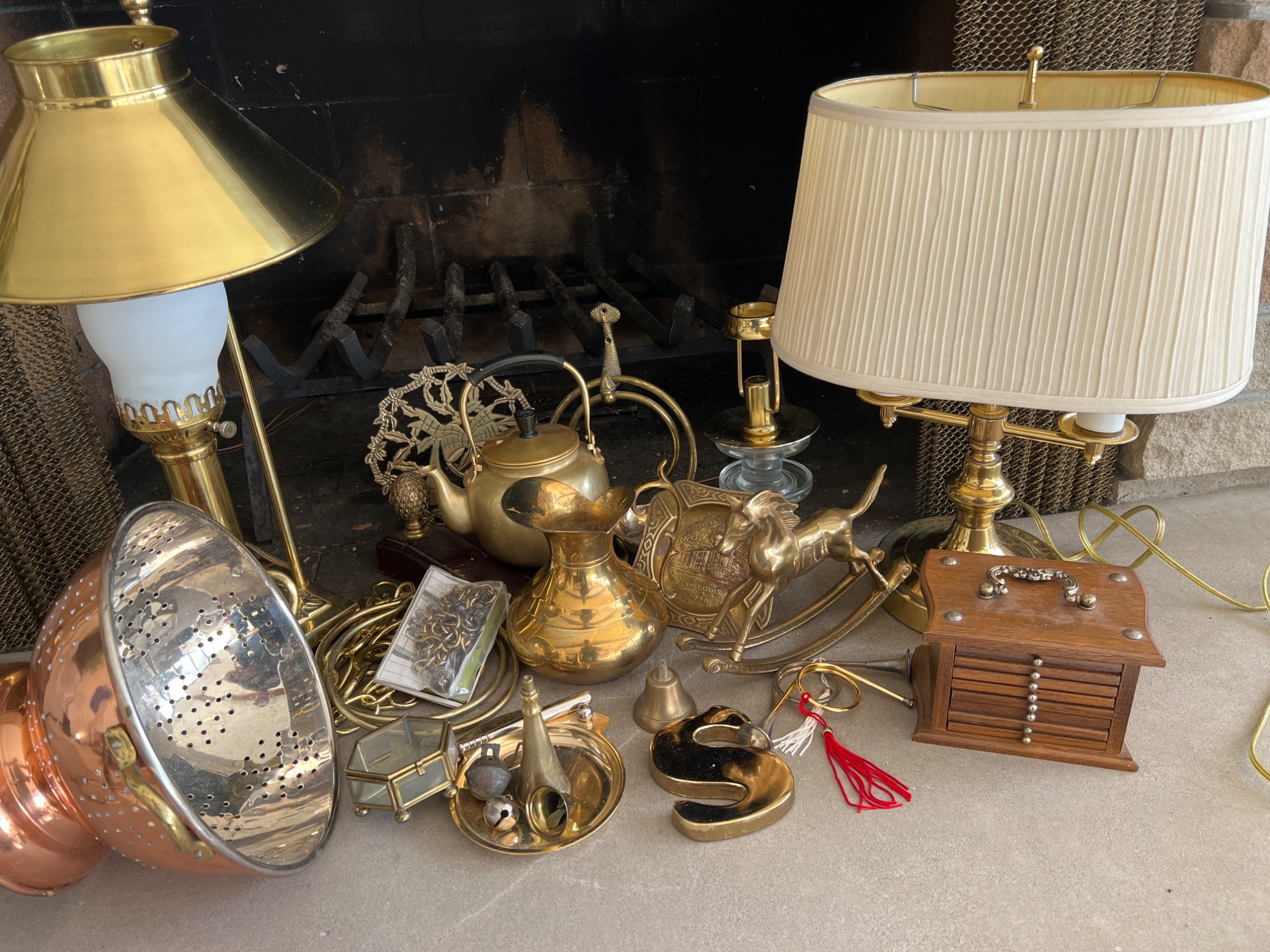 Variety of brass decorations including a vintage rocking horse, decor bugle (made in India), trivet, towel holder, pitcher, chains for hanging light fixtures, two vintage brass lamps, and copper/brass collander - and much more.