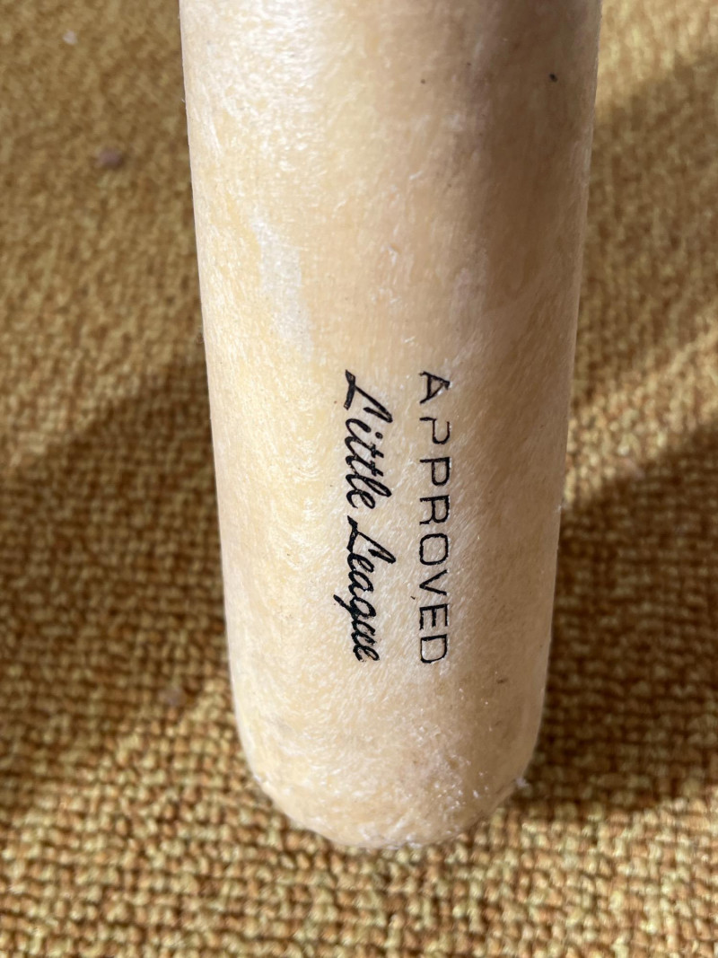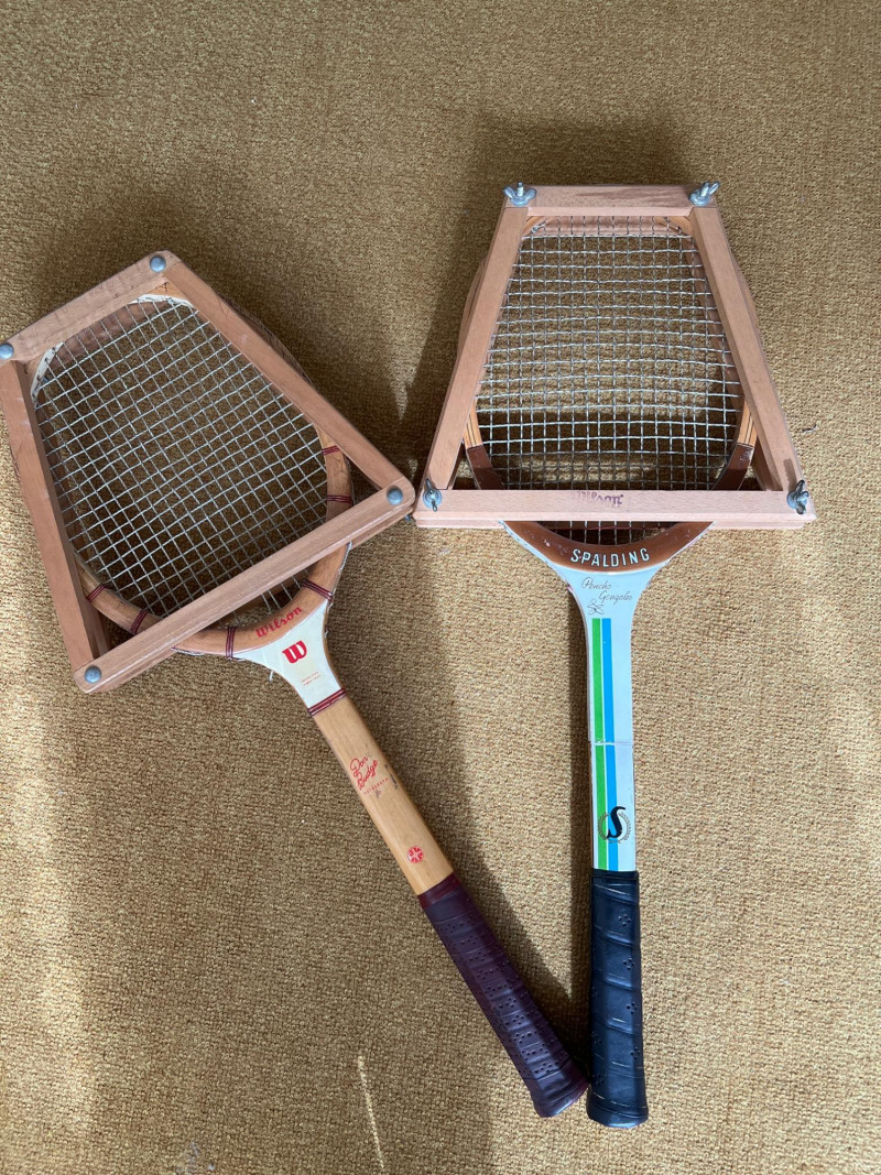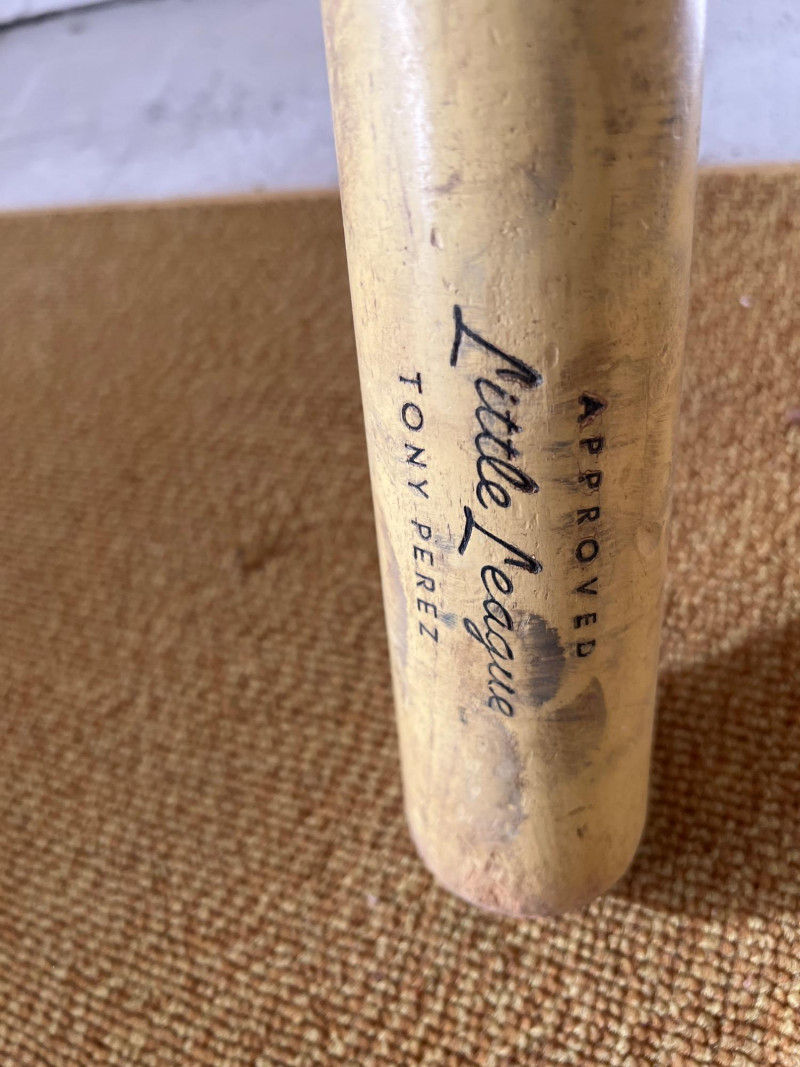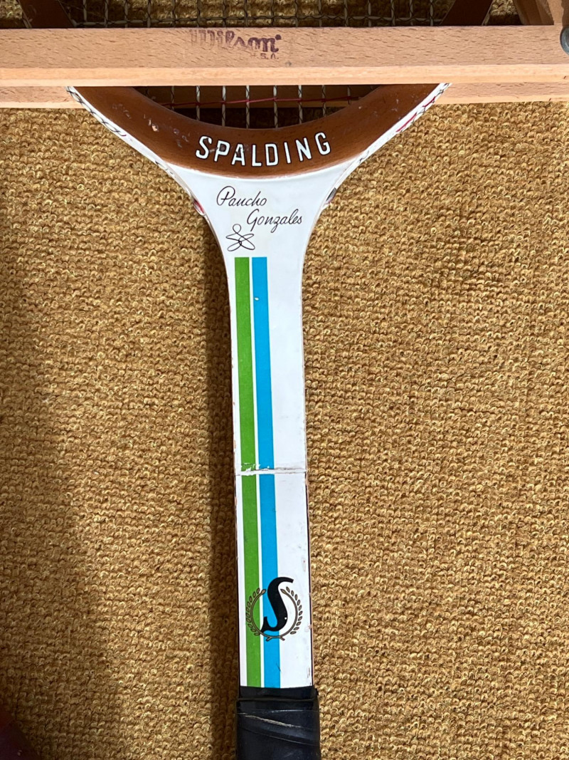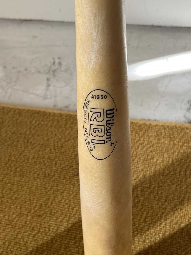 Collection of sports equipment including two Little League bats (H&B J2 and Wilson RBI), Orbatron plastic-coated mid-20th century weights with unique design (10 lbs), Wham-O Master Frisbee, TPE 200 Putter, two wood tennis rackets (Wilson & Spalding) and bag tennis balls perfect for batting practice.