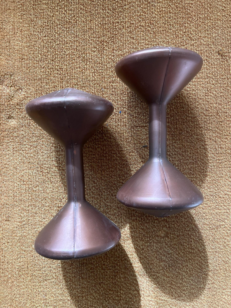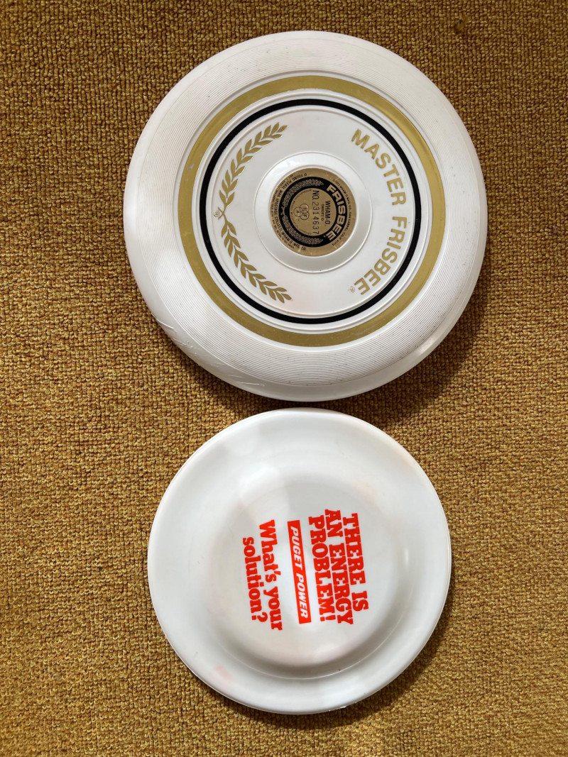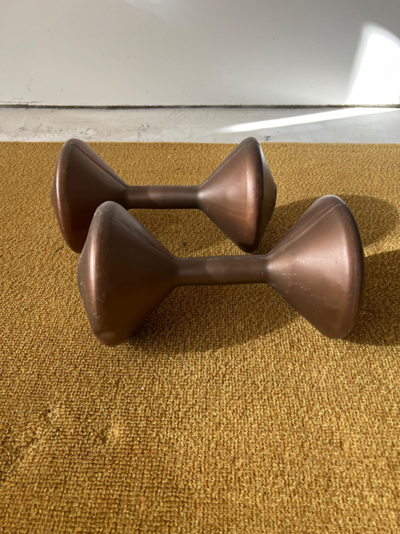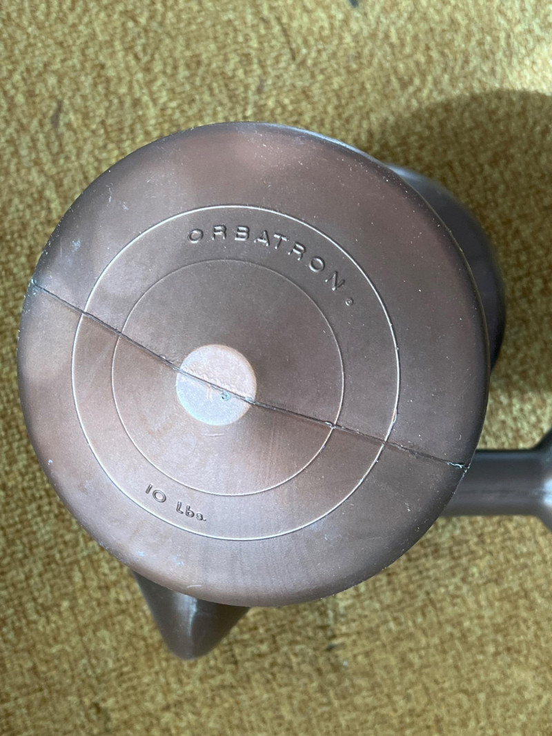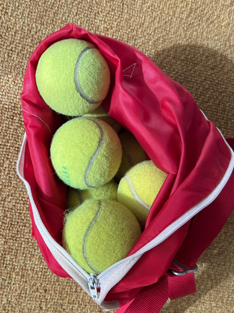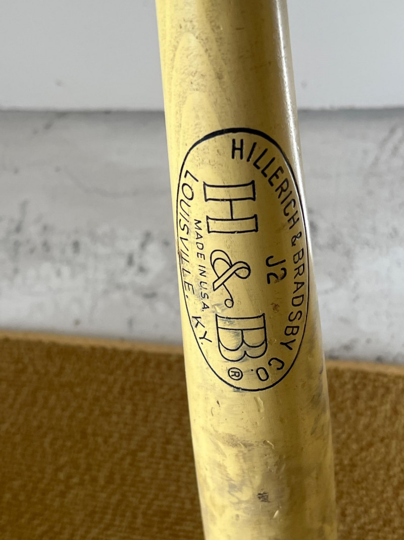 Collection of sports equipment including two Little League bats (H&B J2 and Wilson RBI), Orbatron plastic-coated mid-20th century weights with unique design (10 lbs), Wham-O Master Frisbee, TPE 200 Putter, two wood tennis rackets (Wilson & Spalding) and bag tennis balls perfect for batting practice.