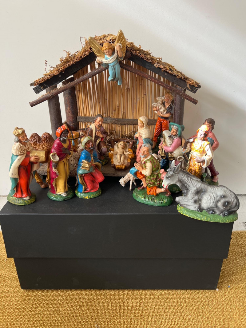 Impressive mid century creche with three kings, shepherds, angel, Joseph, Mary and Jesus. Animals include a donkey, four sheep, cow and camel. Wood and sturdy straw with dried moss manger. Figures range from 4" tall to 8" tall. They have some weight to them (similar texture as Fontanini figures). Hand painted.